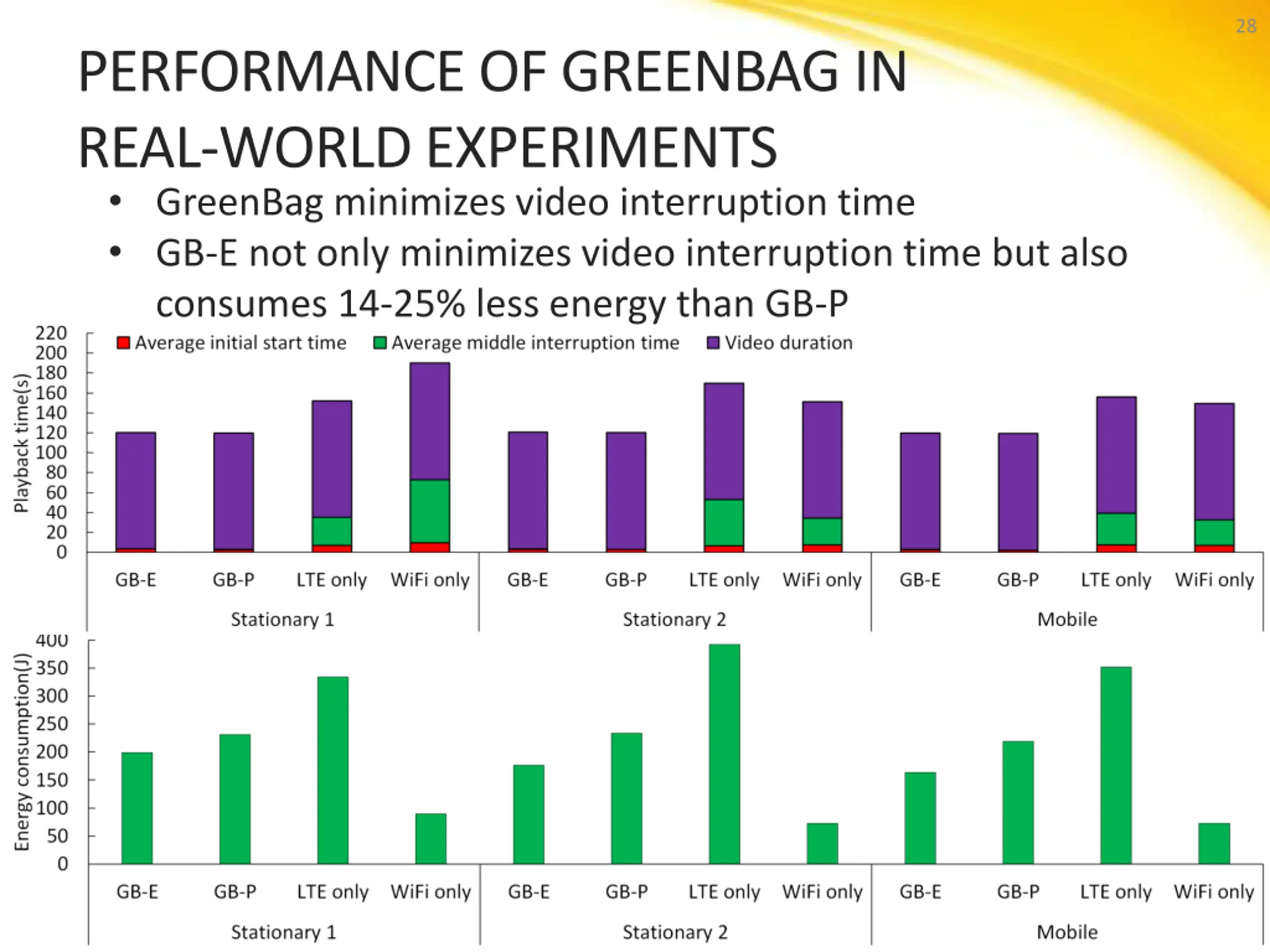 EVALUATION IN REAL-WORLD NETWORKS EXPERIMENT SETUP (2/2) Compare the 4 configurations (GB-E, GB-P, LTE-only, and WiFi-only) in 3 scenarios (Stationary #1, Stationary #2, and Mobile) Three scenarios Stationary #1: Bandwidth of LTE is always greater than of WiFi Stationary #2: Bandwidth of LTE is always smaller than of WiFi Mobile: WiFi bandwidth fluctuates fast and has a drop due to user mobility Stationary #1 Stationary #2 Mobile Average LTE bandwidth (Mbps) 5.14 4.12 4.73 Average WiFi bandwidth (Mbps) 3.85 5.00 4.94 Total average bandwidth (Mbps) 8.99 9.12 9.67 Experimented video has 6.1Mbps average bit rate, and is 117 seconds long 27