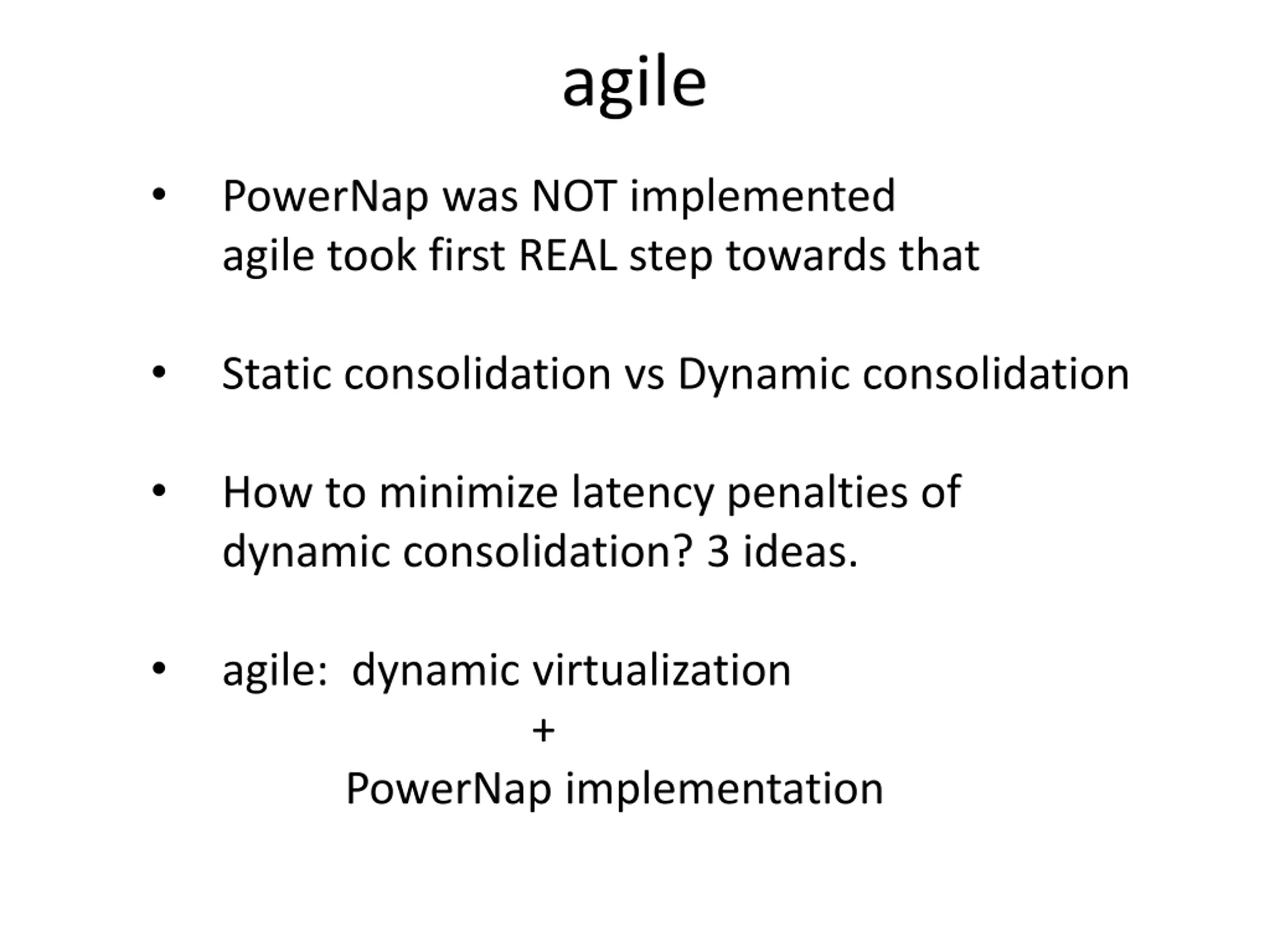 agile PowerNap was NOT implemented agile took first REAL step towards that Static consolidation vs Dynamic consolidation How to minimize latency penalties of dynamic consolidation? 3 ideas. agile: dynamic virtualization PowerNap implementation +