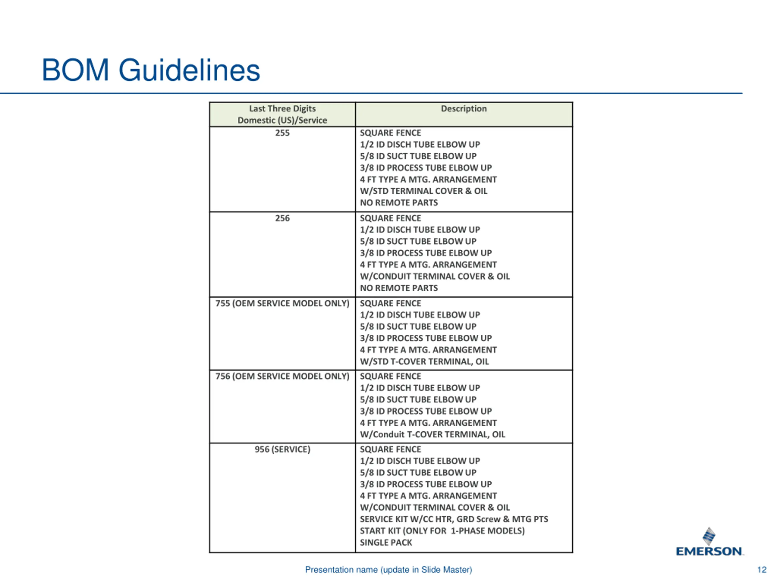 BOM Guidelines Last Three Digits Domestic (US)/Service 255 Description SQUARE FENCE 1/2 ID DISCH TUBE ELBOW UP 5/8 ID SUCT TUBE ELBOW UP 3/8 ID PROCESS TUBE ELBOW UP 4 FT TYPE A MTG. ARRANGEMENT W/STD TERMINAL COVER & OIL NO REMOTE PARTS 256 SQUARE FENCE 1/2 ID DISCH TUBE ELBOW UP 5/8 ID SUCT TUBE ELBOW UP 3/8 ID PROCESS TUBE ELBOW UP 4 FT TYPE A MTG. ARRANGEMENT W/CONDUIT TERMINAL COVER & OIL NO REMOTE PARTS 755 (OEM SERVICE MODEL ONLY) SQUARE FENCE 1/2 ID DISCH TUBE ELBOW UP 5/8 ID SUCT TUBE ELBOW UP 3/8 ID PROCESS TUBE ELBOW UP 4 FT TYPE A MTG. ARRANGEMENT W/STD T-COVER TERMINAL, OIL 756 (OEM SERVICE MODEL ONLY) SQUARE FENCE 1/2 ID DISCH TUBE ELBOW UP 5/8 ID SUCT TUBE ELBOW UP 3/8 ID PROCESS TUBE ELBOW UP 4 FT TYPE A MTG. ARRANGEMENT W/Conduit T-COVER TERMINAL, OIL 956 (SERVICE) SQUARE FENCE 1/2 ID DISCH TUBE ELBOW UP 5/8 ID SUCT TUBE ELBOW UP 3/8 ID PROCESS TUBE ELBOW UP 4 FT TYPE A MTG. ARRANGEMENT W/CONDUIT TERMINAL COVER & OIL SERVICE KIT W/CC HTR, GRD Screw & MTG PTS START KIT (ONLY FOR 1-PHASE MODELS) SINGLE PACK Presentation name (update in Slide Master) 12