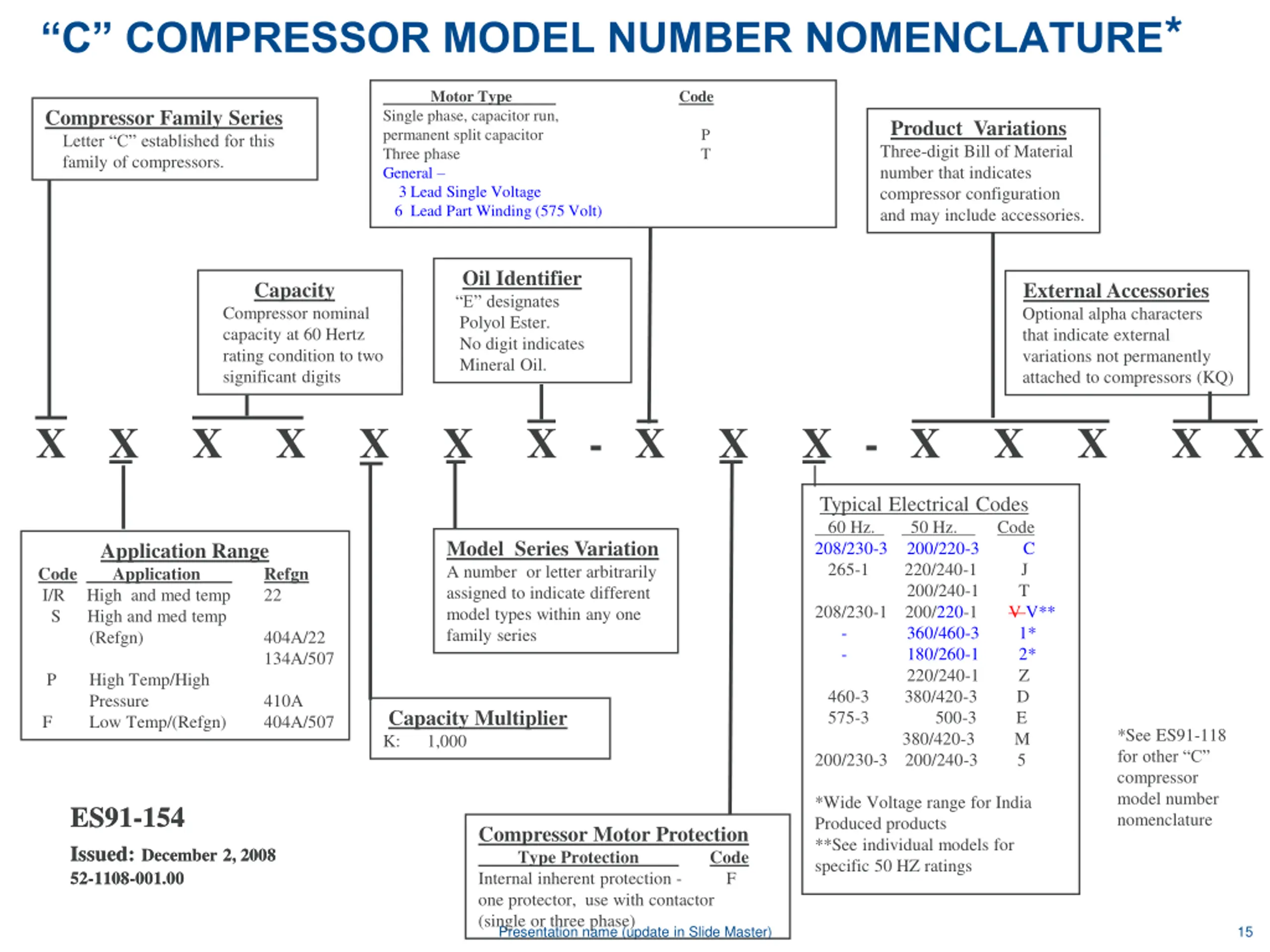 C COMPRESSOR MODEL NUMBER NOMENCLATURE* Motor Type Single phase, capacitor run, permanent split capacitor P Three phase T General 3 Lead Single Voltage 6 Lead Part Winding (575 Volt) Code Compressor Family Series Letter C established for this family of compressors. Product Variations Three-digit Bill of Material number that indicates compressor configuration and may include accessories. Oil Identifier E designates Polyol Ester. No digit indicates Mineral Oil. Capacity Compressor nominal capacity at 60 Hertz rating condition to two significant digits External Accessories Optional alpha characters that indicate external variations not permanently attached to compressors (KQ) X X X X X X X - X X X - X X X X X Typical Electrical Codes 60 Hz. 50 Hz. 208/230-3 200/220-3 C 265-1 220/240-1 J 200/240-1 T 208/230-1 200/220-1 V V** - 360/460-3 1* - 180/260-1 2* 220/240-1 Z 460-3 380/420-3 D 575-3 500-3 E 380/420-3 M 200/230-3 200/240-3 5 Code Model Series Variation A number or letter arbitrarily assigned to indicate different model types within any one family series Application Range Code Application I/R High and med temp S High and med temp (Refgn) P High Temp/High Pressure F Low Temp/(Refgn) Refgn 22 404A/22 134A/507 410A 404A/507 Capacity Multiplier K: 1,000 *See ES91-118 for other C compressor model number nomenclature *Wide Voltage range for India Produced products **See individual models for specific 50 HZ ratings ES91-154 Issued:December 2, 2008 ES91-154 Issued:December 2, 2008 52-1108-001.00 52-1108-001.00 Compressor Motor Protection Type Protection Internal inherent protection - F one protector, use with contactor (single or three phase) Code Presentation name (update in Slide Master) 15