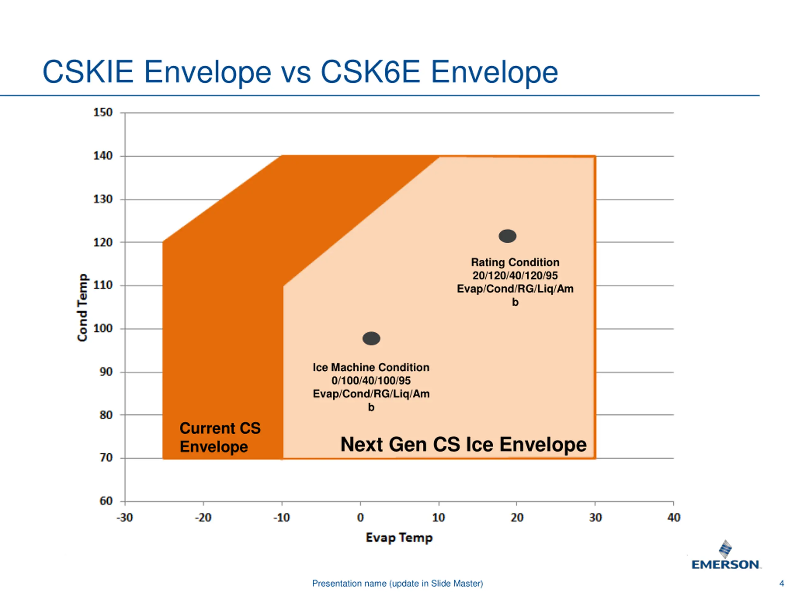 CSKIE Advantages over existing CSK6E Efficiency Operating Envelope Optimized for Ice True Medium Temp -10 F to 30 F Reliability Similar to existing CS Sound Similar to existing CS Footprint and Dimensions Similar to existing CS Refrigerants R404A 6% EER Improvement Over existing CS Presentation name (update in Slide Master) 3