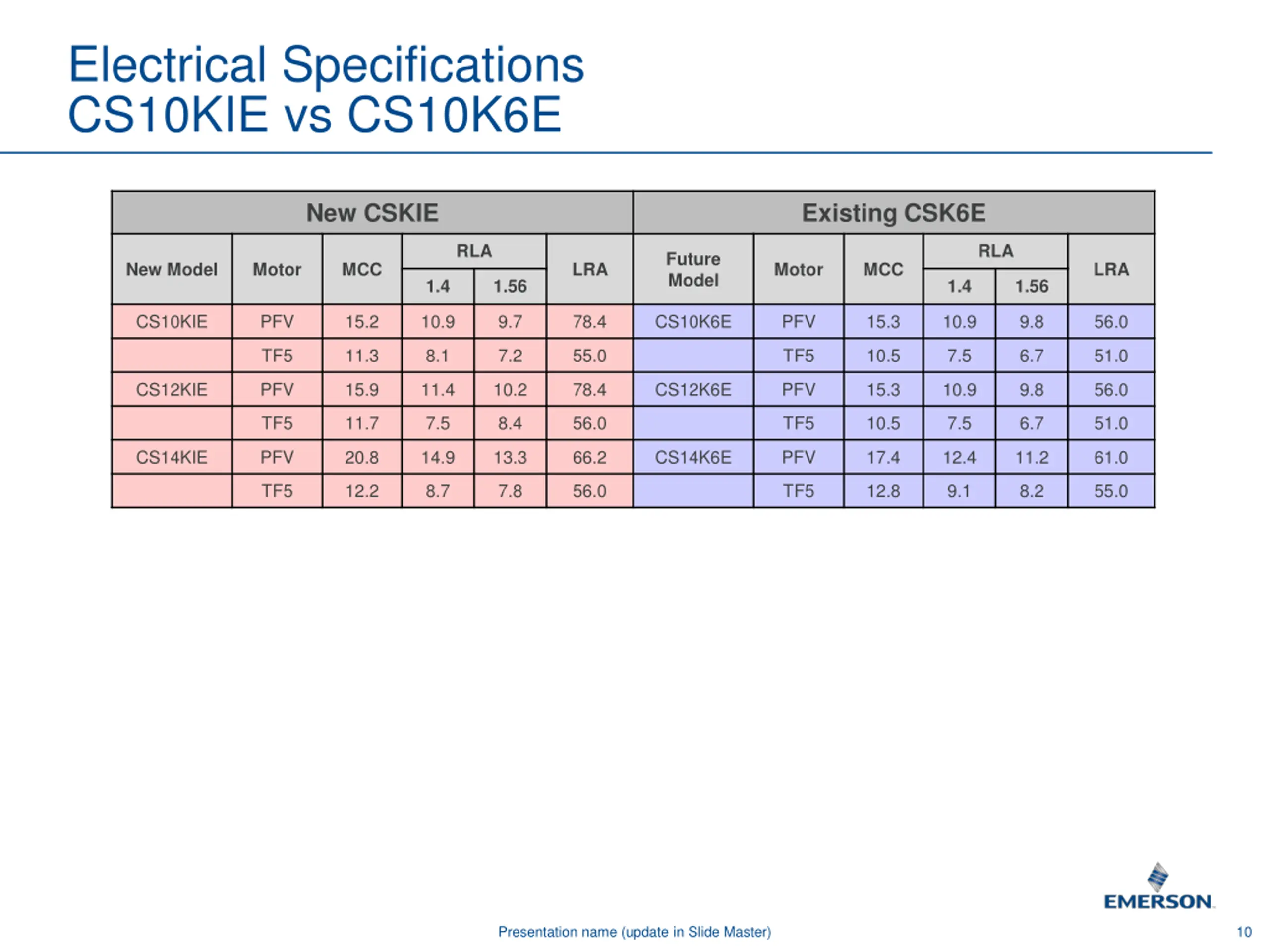 Electrical Specifications CS10KIE vs CS10K6E New CSKIE Existing CSK6E RLA RLA Future Model New Model Motor MCC LRA Motor MCC LRA 1.4 1.56 1.4 1.56 CS10KIE PFV 15.2 10.9 9.7 78.4 CS10K6E PFV 15.3 10.9 9.8 56.0 TF5 11.3 8.1 7.2 55.0 TF5 10.5 7.5 6.7 51.0 CS12KIE PFV 15.9 11.4 10.2 78.4 CS12K6E PFV 15.3 10.9 9.8 56.0 TF5 11.7 7.5 8.4 56.0 TF5 10.5 7.5 6.7 51.0 CS14KIE PFV 20.8 14.9 13.3 66.2 CS14K6E PFV 17.4 12.4 11.2 61.0 TF5 12.2 8.7 7.8 56.0 TF5 12.8 9.1 8.2 55.0 Presentation name (update in Slide Master) 10