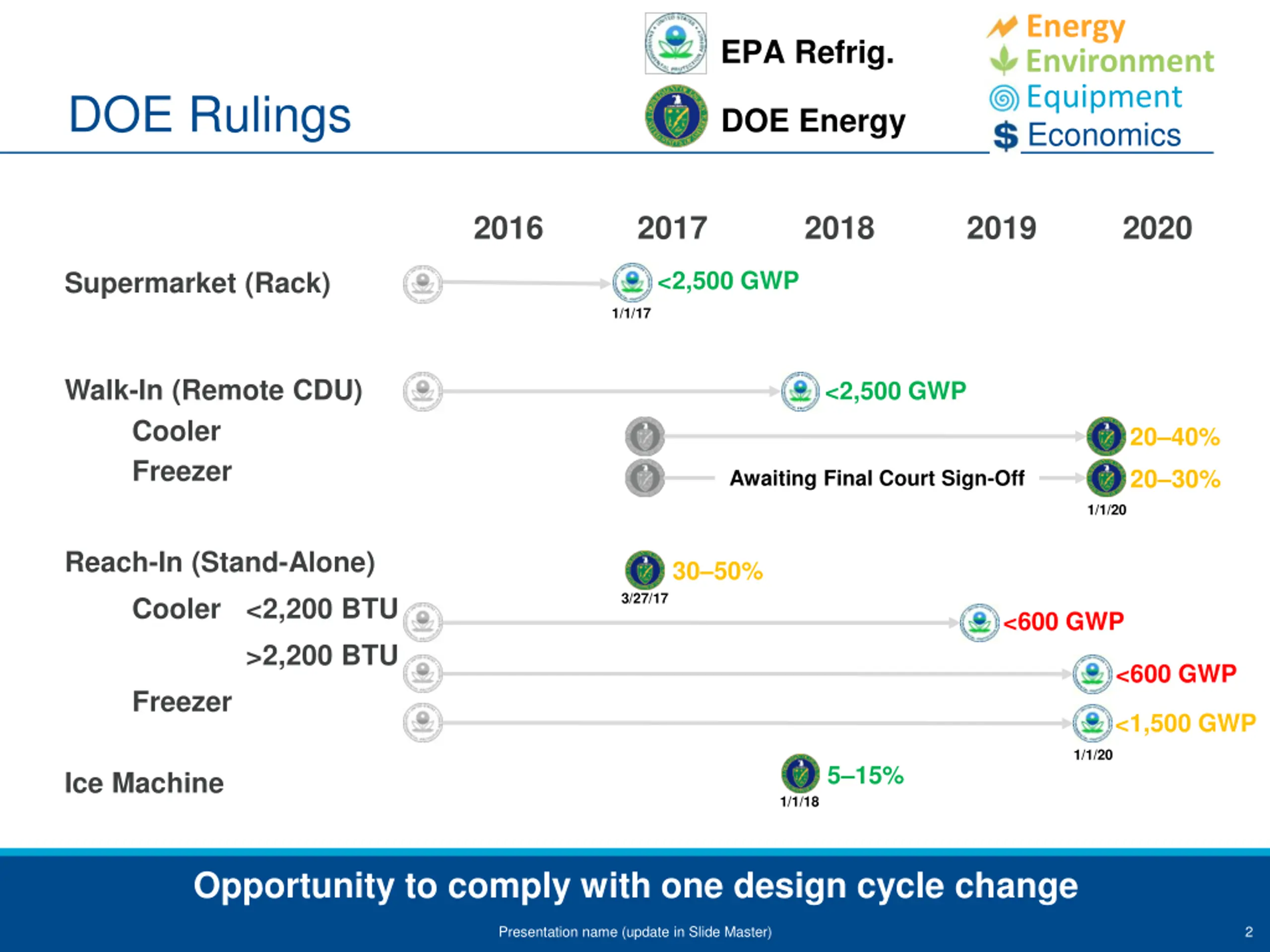 Energy Environment Equipment EPA Refrig. DOE Rulings DOE Energy Economics 2016 2017 2018 2019 2020 <2,500 GWP Supermarket (Rack) 1/1/17 Walk-In (Remote CDU) Cooler Freezer <2,500 GWP 20 40% 20 30% Awaiting Final Court Sign-Off 1/1/20 Reach-In (Stand-Alone) Cooler <2,200 BTU 30 50% 3/27/17 <600 GWP >2,200 BTU <600 GWP Freezer <1,500 GWP 1/1/20 5 15% Ice Machine 1/1/18 Opportunity to comply with one design cycle change Presentation name (update in Slide Master) Presentation name (update in Slide Master) 2 2