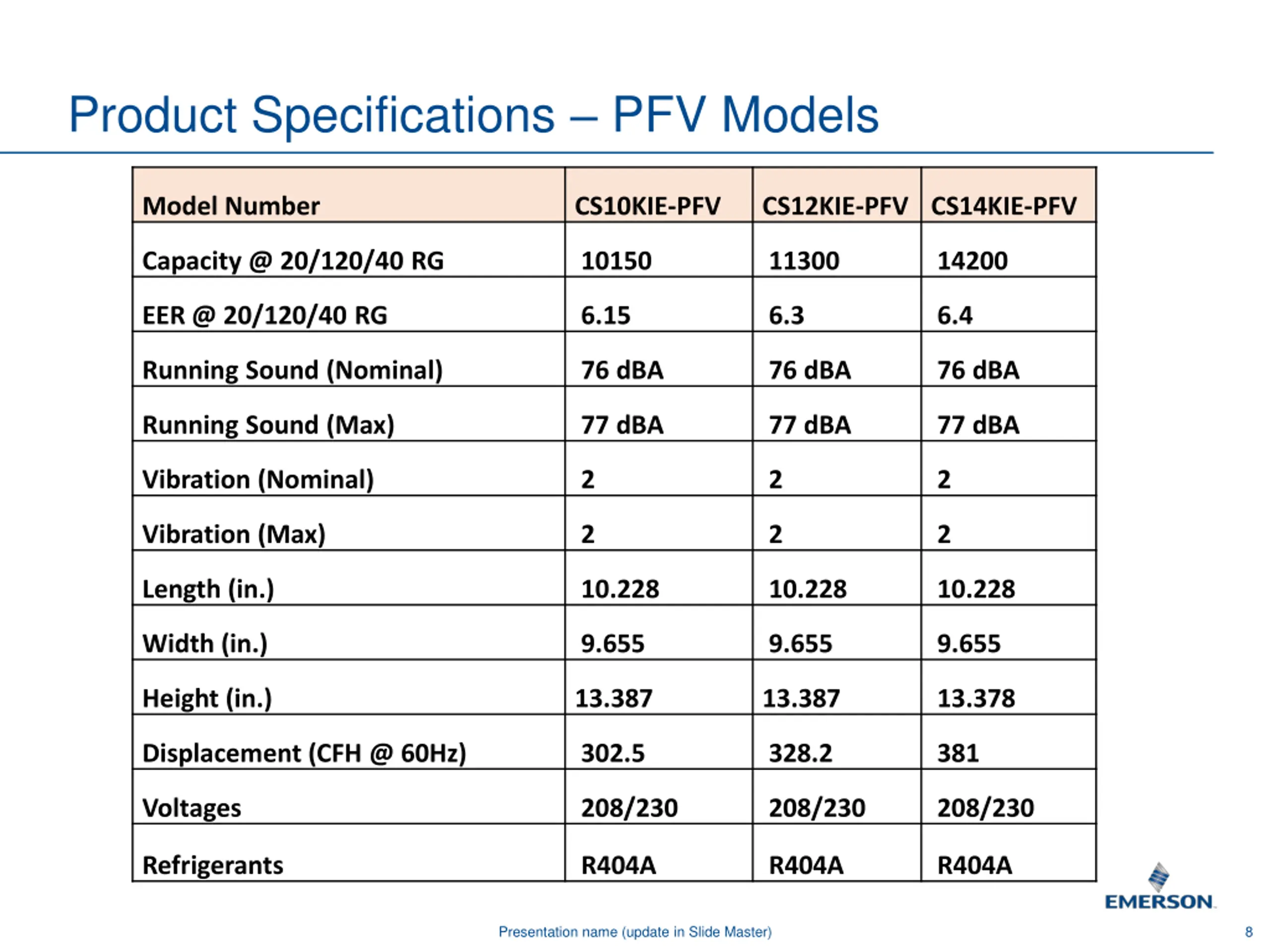 Product Specifications PFV Models Model Number CS10KIE-PFV CS12KIE-PFV CS14KIE-PFV Capacity @ 20/120/40 RG 10150 11300 14200 EER @ 20/120/40 RG 6.15 6.3 6.4 Running Sound (Nominal) 76 dBA 76 dBA 76 dBA Running Sound (Max) 77 dBA 77 dBA 77 dBA Vibration (Nominal) 2 2 2 Vibration (Max) 2 2 2 Length (in.) 10.228 10.228 10.228 Width (in.) 9.655 9.655 9.655 Height (in.) 13.387 13.387 13.378 Displacement (CFH @ 60Hz) 302.5 328.2 381 Voltages 208/230 208/230 208/230 Refrigerants R404A R404A R404A Presentation name (update in Slide Master) 8