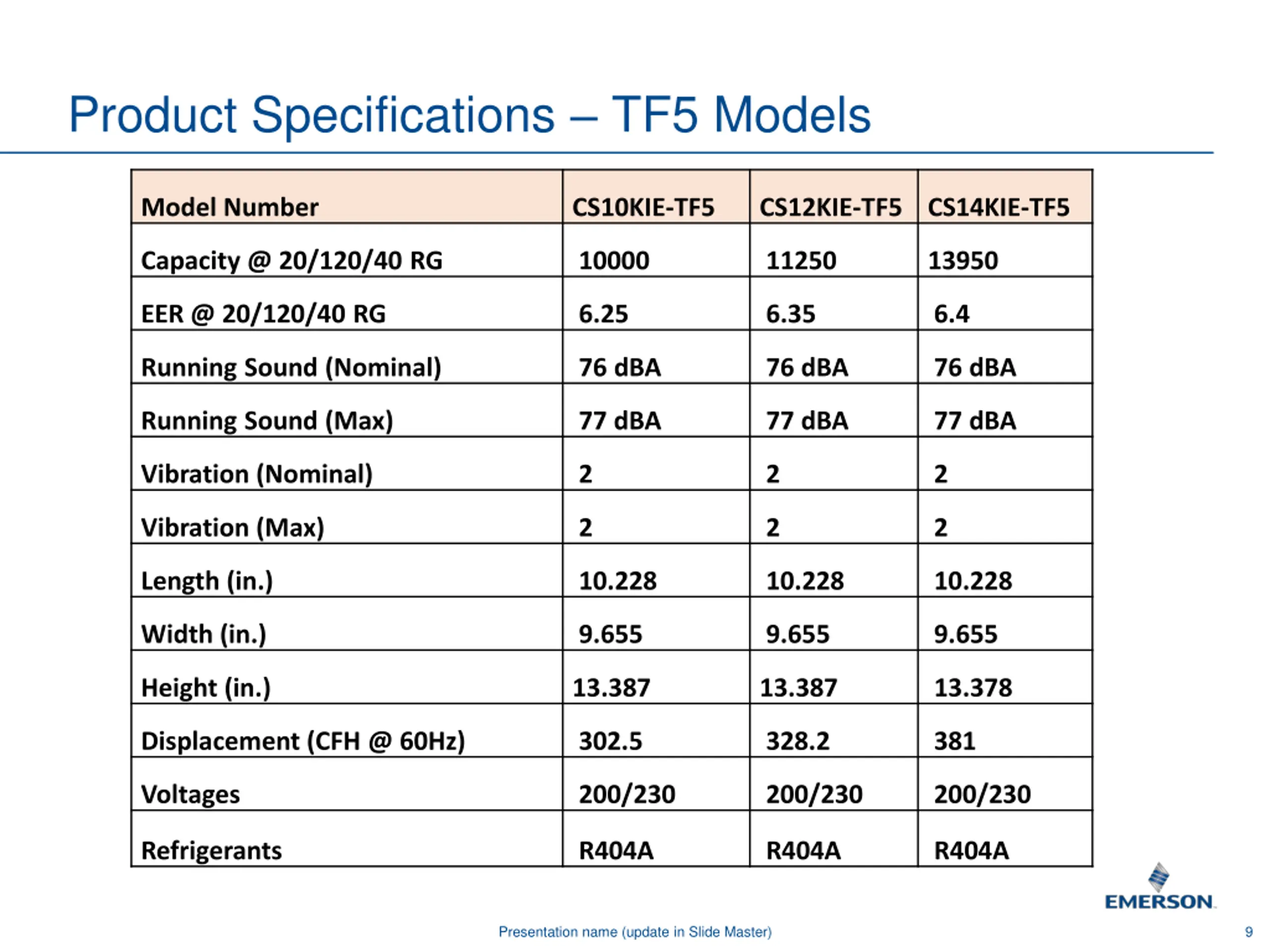 Product Specifications TF5 Models Model Number CS10KIE-TF5 CS12KIE-TF5 CS14KIE-TF5 Capacity @ 20/120/40 RG 10000 11250 13950 EER @ 20/120/40 RG 6.25 6.35 6.4 Running Sound (Nominal) 76 dBA 76 dBA 76 dBA Running Sound (Max) 77 dBA 77 dBA 77 dBA Vibration (Nominal) 2 2 2 Vibration (Max) 2 2 2 Length (in.) 10.228 10.228 10.228 Width (in.) 9.655 9.655 9.655 Height (in.) 13.387 13.387 13.378 Displacement (CFH @ 60Hz) 302.5 328.2 381 Voltages 200/230 200/230 200/230 Refrigerants R404A R404A R404A Presentation name (update in Slide Master) 9
