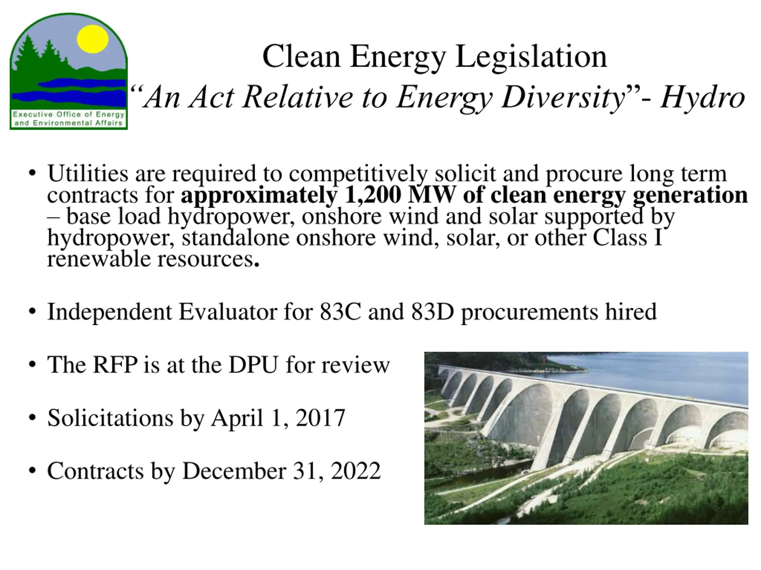 Clean Energy Legislation An Act Relative to Energy Diversity - Hydro Utilities are required to competitively solicit and procure long term contracts for approximately 1,200 MW of clean energy generation base load hydropower, onshore wind and solar supported by hydropower, standalone onshore wind, solar, or other Class I renewable resources. Independent Evaluator for 83C and 83D procurements hired The RFP is at the DPU for review Solicitations by April 1, 2017 Contracts by December 31, 2022