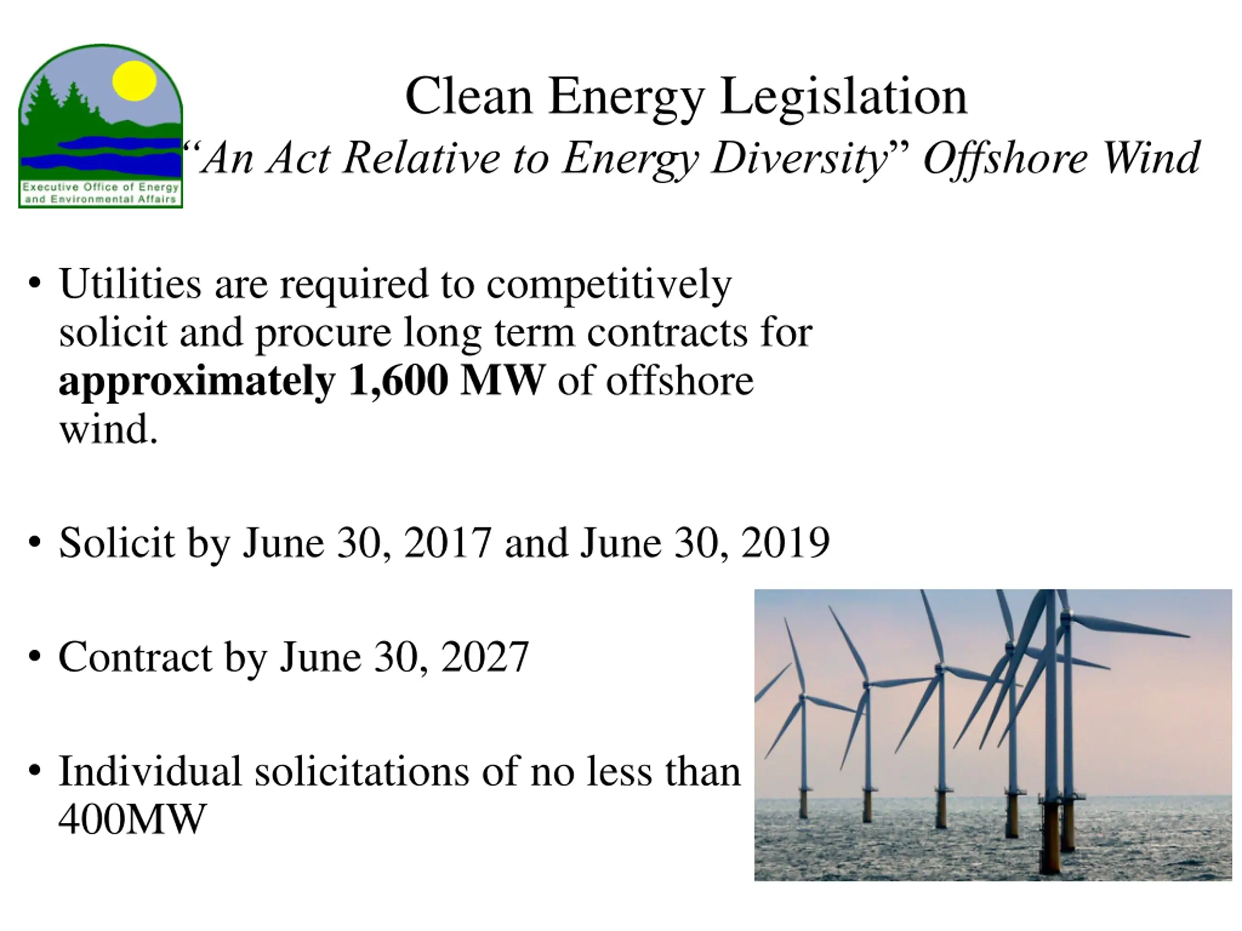 Clean Energy Legislation An Act Relative to Energy Diversity Offshore Wind Utilities are required to competitively solicit and procure long term contracts for approximately 1,600 MW of offshore wind. Solicit by June 30, 2017 and June 30, 2019 Contract by June 30, 2027 Individual solicitations of no less than 400MW