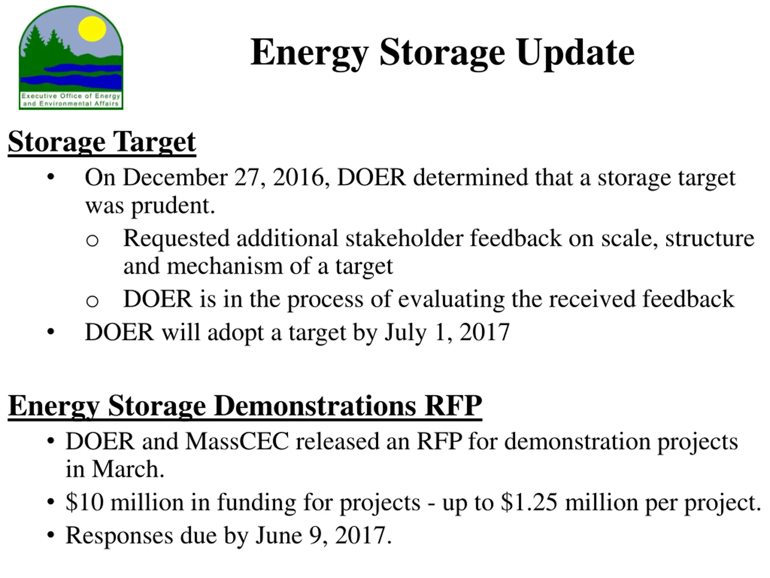 Energy Storage Update Storage Target On December 27, 2016, DOER determined that a storage target was prudent. o Requested additional stakeholder feedback on scale, structure and mechanism of a target o DOER is in the process of evaluating the received feedback DOER will adopt a target by July 1, 2017 Energy Storage Demonstrations RFP DOER and MassCEC released an RFP for demonstration projects in March. $10 million in funding for projects - up to $1.25 million per project. Responses due by June 9, 2017.