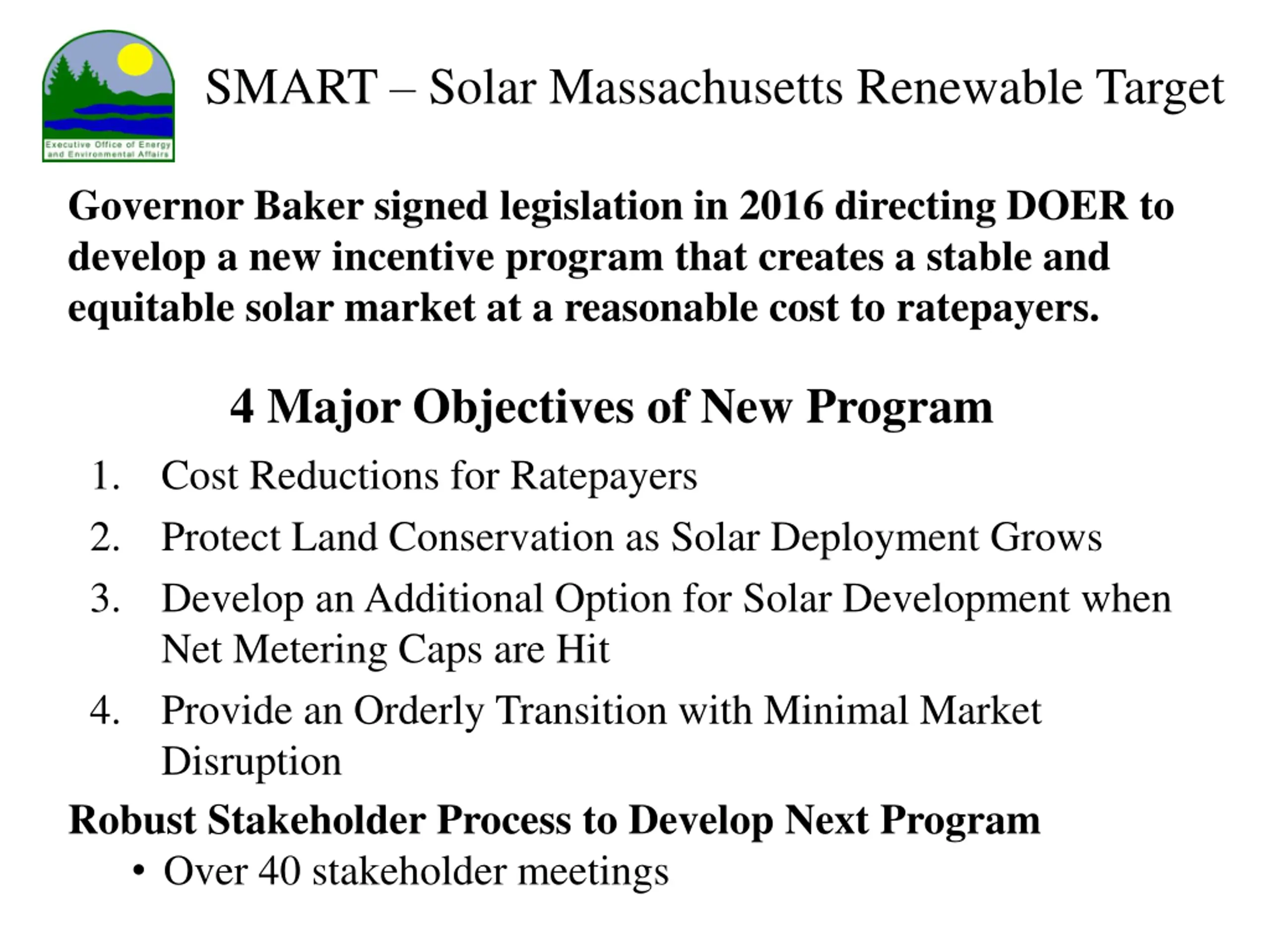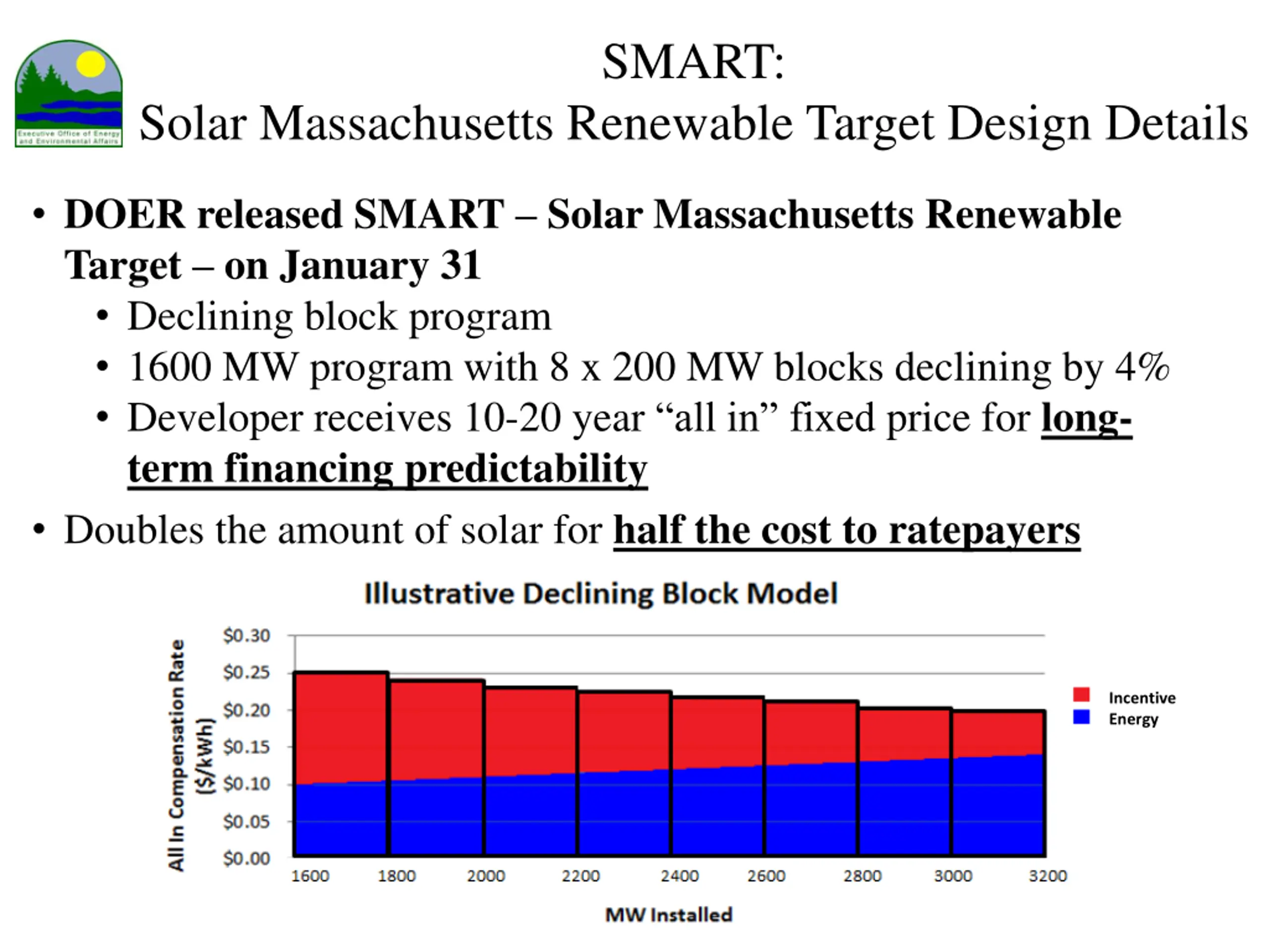 SMART: Solar Massachusetts Renewable Target Design Details DOER released SMART Solar Massachusetts Renewable Target on January 31 Declining block program 1600 MW program with 8 x 200 MW blocks declining by 4% Developer receives 10-20 year all in fixed price for long- term financing predictability Doubles the amount of solar for half the cost to ratepayers Incentive Energy