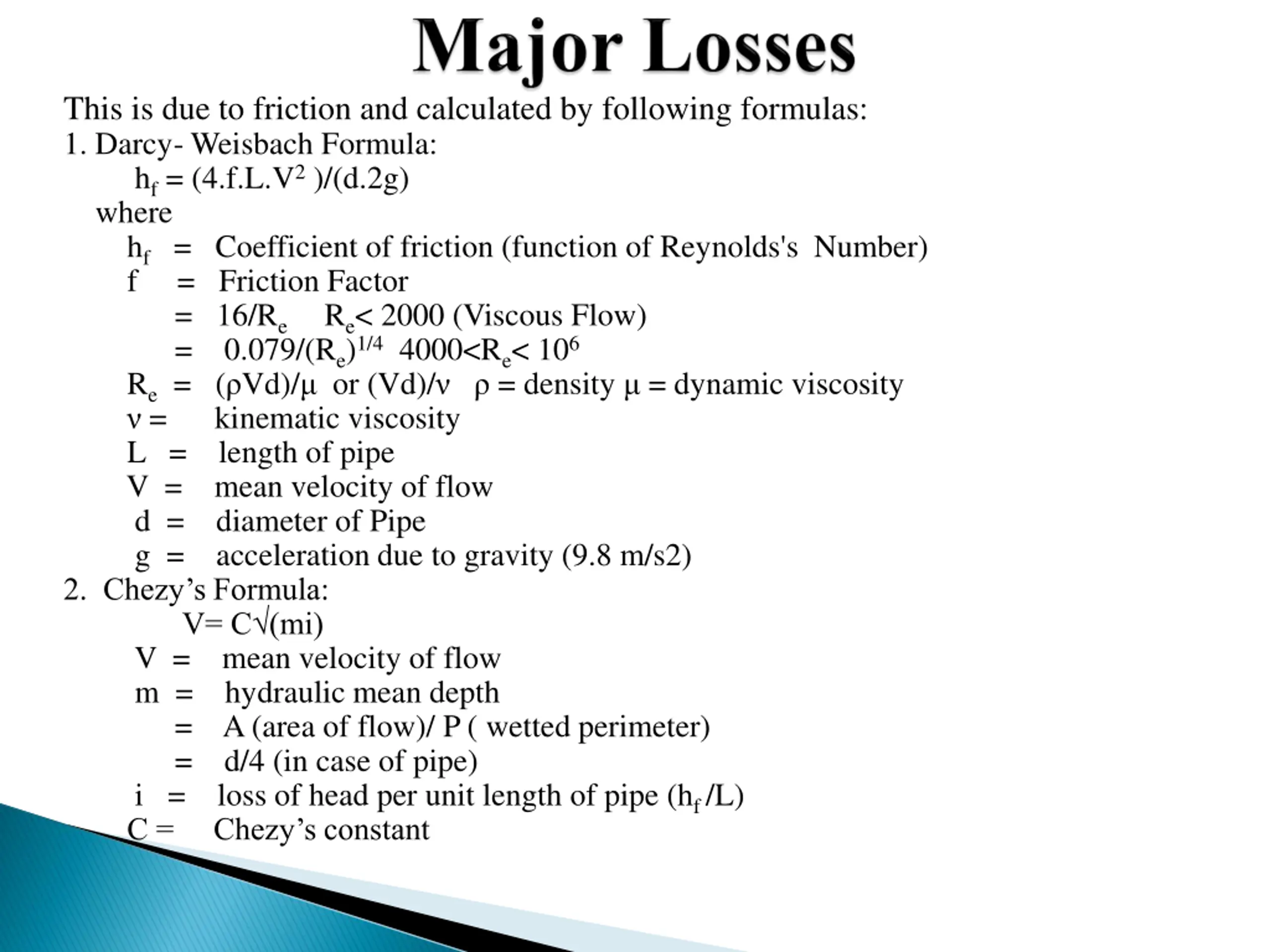 This is due to friction and calculated by following formulas: 1. Darcy- Weisbach Formula: hf= (4.f.L.V2)/(d.2g) where hf = Coefficient of friction (function of Reynolds's Number) f = Friction Factor = 16/Re Re< 2000 (Viscous Flow) = 0.079/(Re)1/44000<Re< 106 Re = ( Vd)/ or (Vd)/ = density = dynamic viscosity = kinematic viscosity L = length of pipe V = mean velocity of flow d = diameter of Pipe g = acceleration due to gravity (9.8 m/s2) 2. Chezy s Formula: V= C (mi) V = mean velocity of flow m = hydraulic mean depth = A (area of flow)/ P ( wetted perimeter) = d/4 (in case of pipe) i = loss of head per unit length of pipe (hf /L) C = Chezy s constant