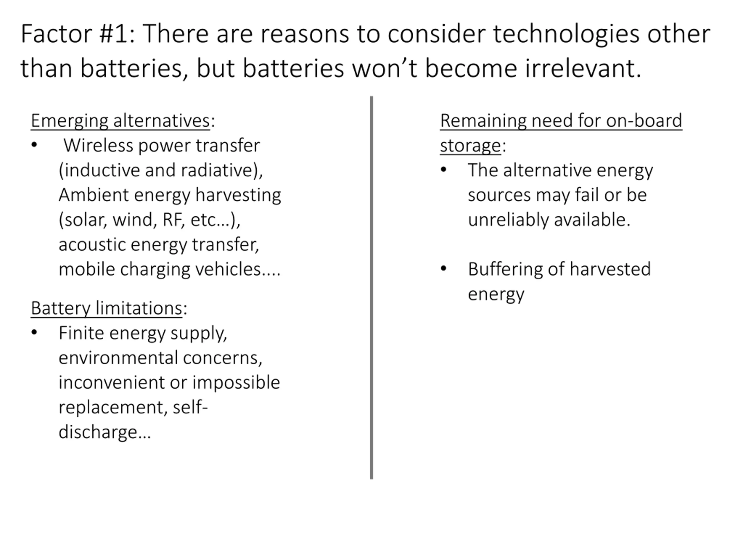 Factor #1: There are reasons to consider technologies other than batteries, but batteries won t become irrelevant. Emerging alternatives: Wireless power transfer (inductive and radiative), Ambient energy harvesting (solar, wind, RF, etc ), acoustic energy transfer, mobile charging vehicles.... Remaining need for on-board storage: The alternative energy sources may fail or be unreliably available. Buffering of harvested energy Battery limitations: Finite energy supply, environmental concerns, inconvenient or impossible replacement, self- discharge