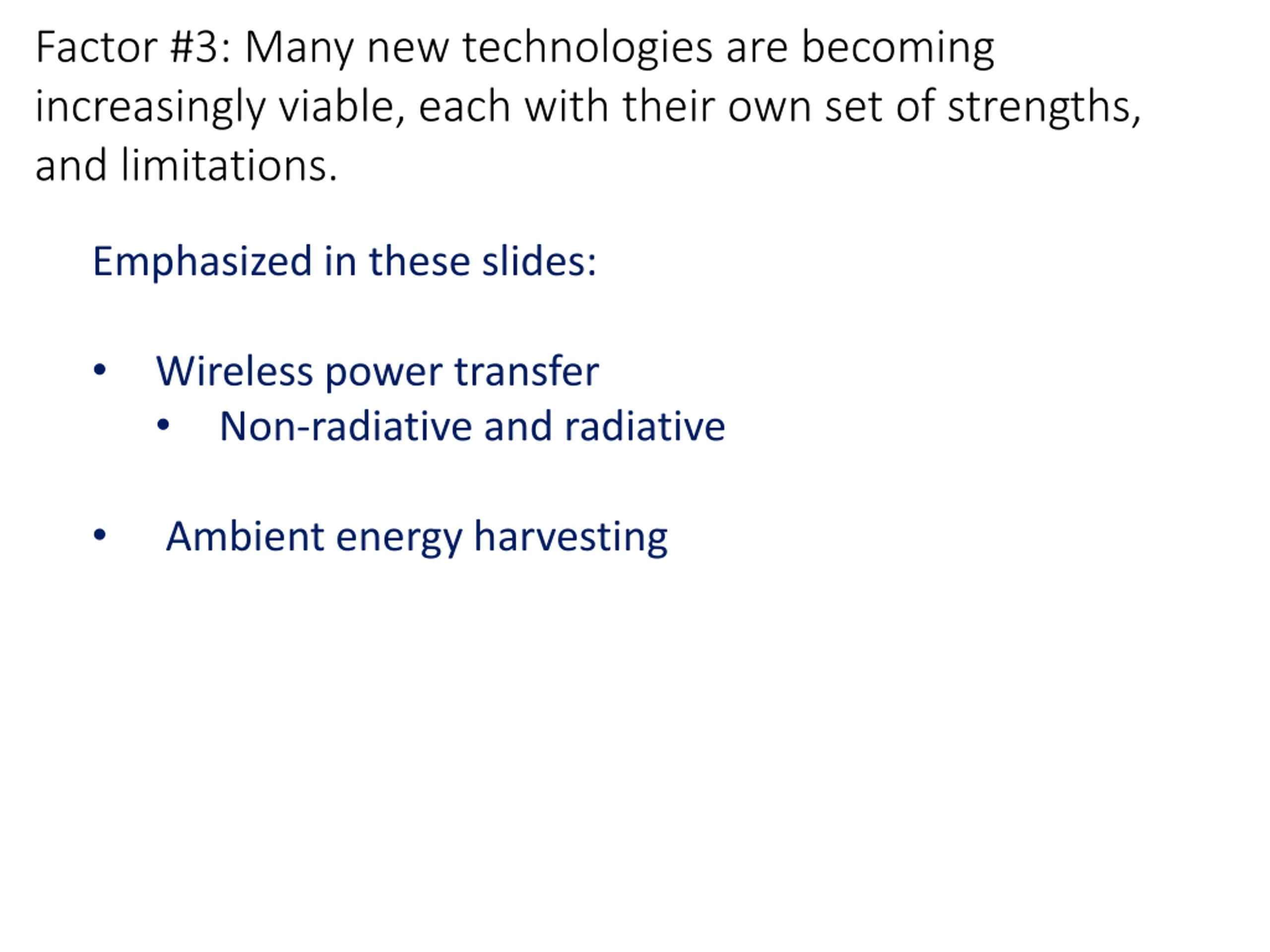 Factor #3: Many new technologies are becoming increasingly viable, each with their own set of strengths, and limitations. Emphasized in these slides: Wireless power transfer Non-radiative and radiative Ambient energy harvesting