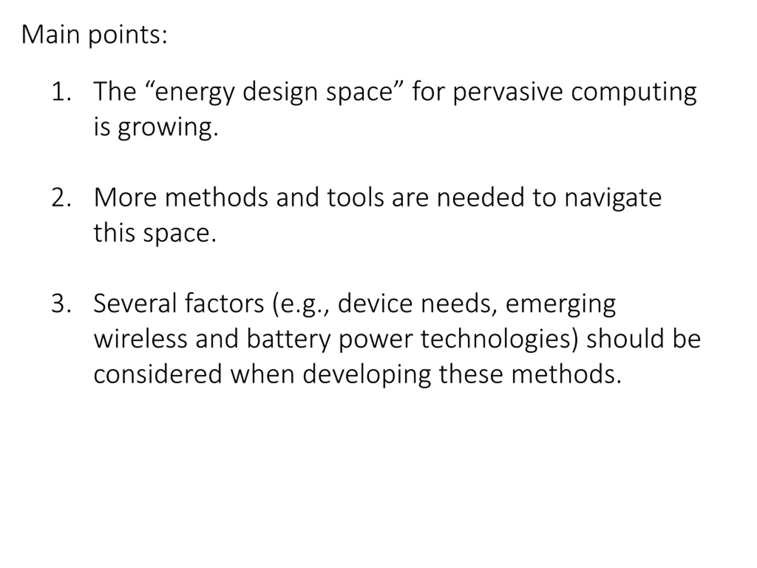 Main points: 1. The energy design space for pervasive computing is growing. 2. More methods and tools are needed to navigate this space. 3. Several factors (e.g., device needs, emerging wireless and battery power technologies) should be considered when developing these methods.