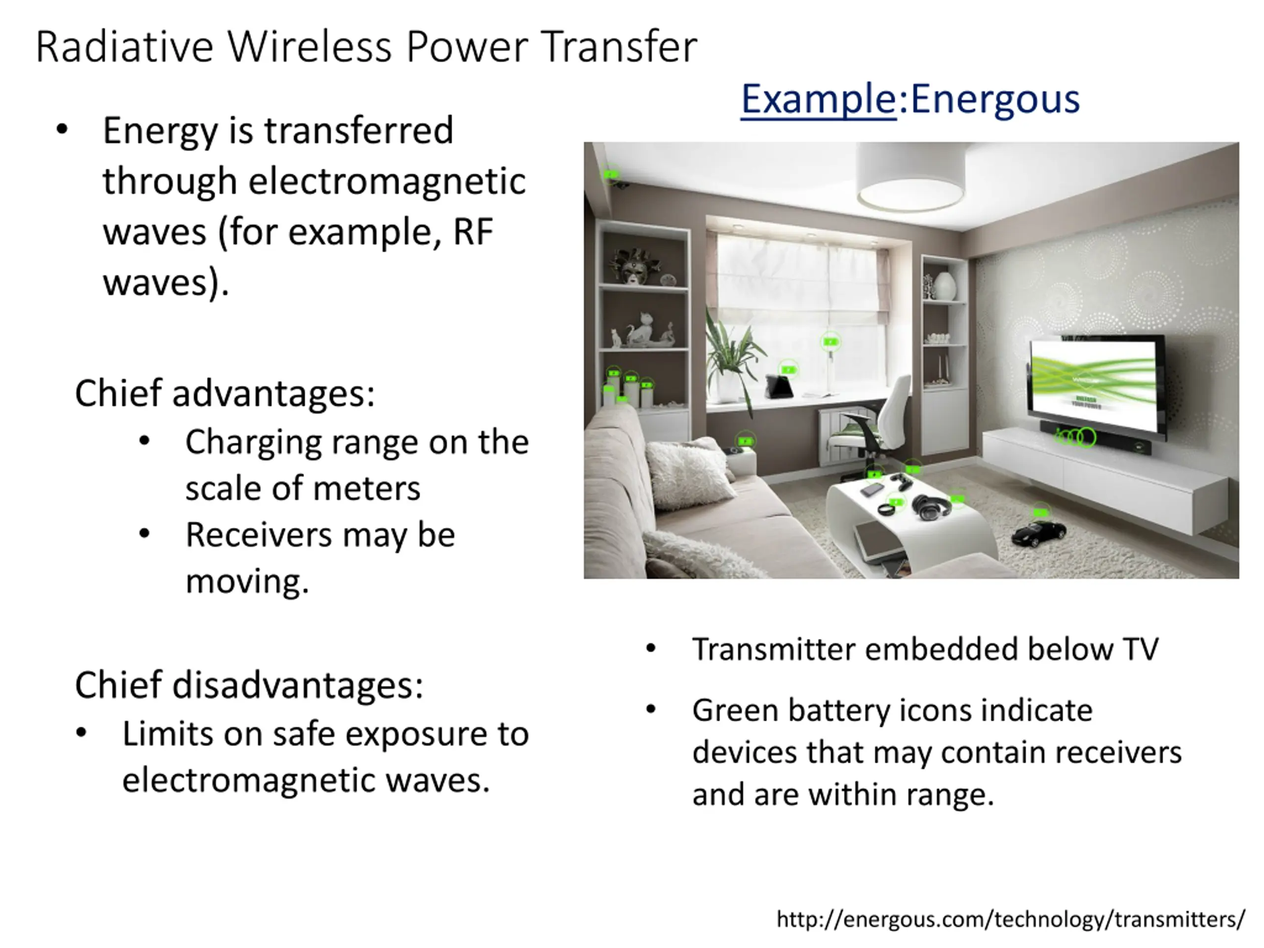Radiative Wireless Power Transfer Example:Energous Energy is transferred through electromagnetic waves (for example, RF waves). Chief advantages: Charging range on the scale of meters Receivers may be moving. Transmitter embedded below TV Chief disadvantages: Limits on safe exposure to electromagnetic waves. Green battery icons indicate devices that may contain receivers and are within range. http://energous.com/technology/transmitters/