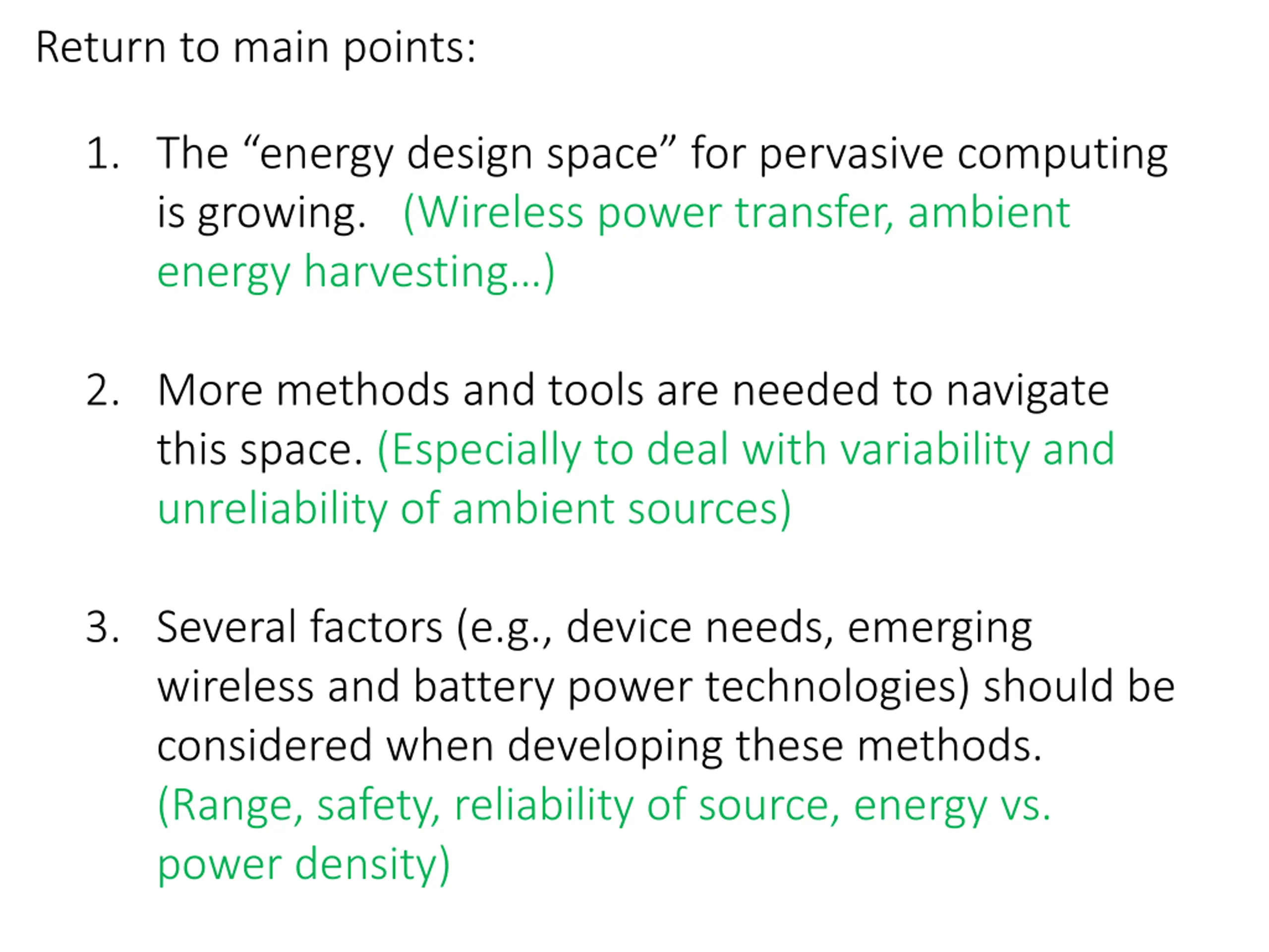 Return to main points: 1. The energy design space for pervasive computing is growing. (Wireless power transfer, ambient energy harvesting ) 2. More methods and tools are needed to navigate this space. (Especially to deal with variability and unreliability of ambient sources) 3. Several factors (e.g., device needs, emerging wireless and battery power technologies) should be considered when developing these methods. (Range, safety, reliability of source, energy vs. power density)