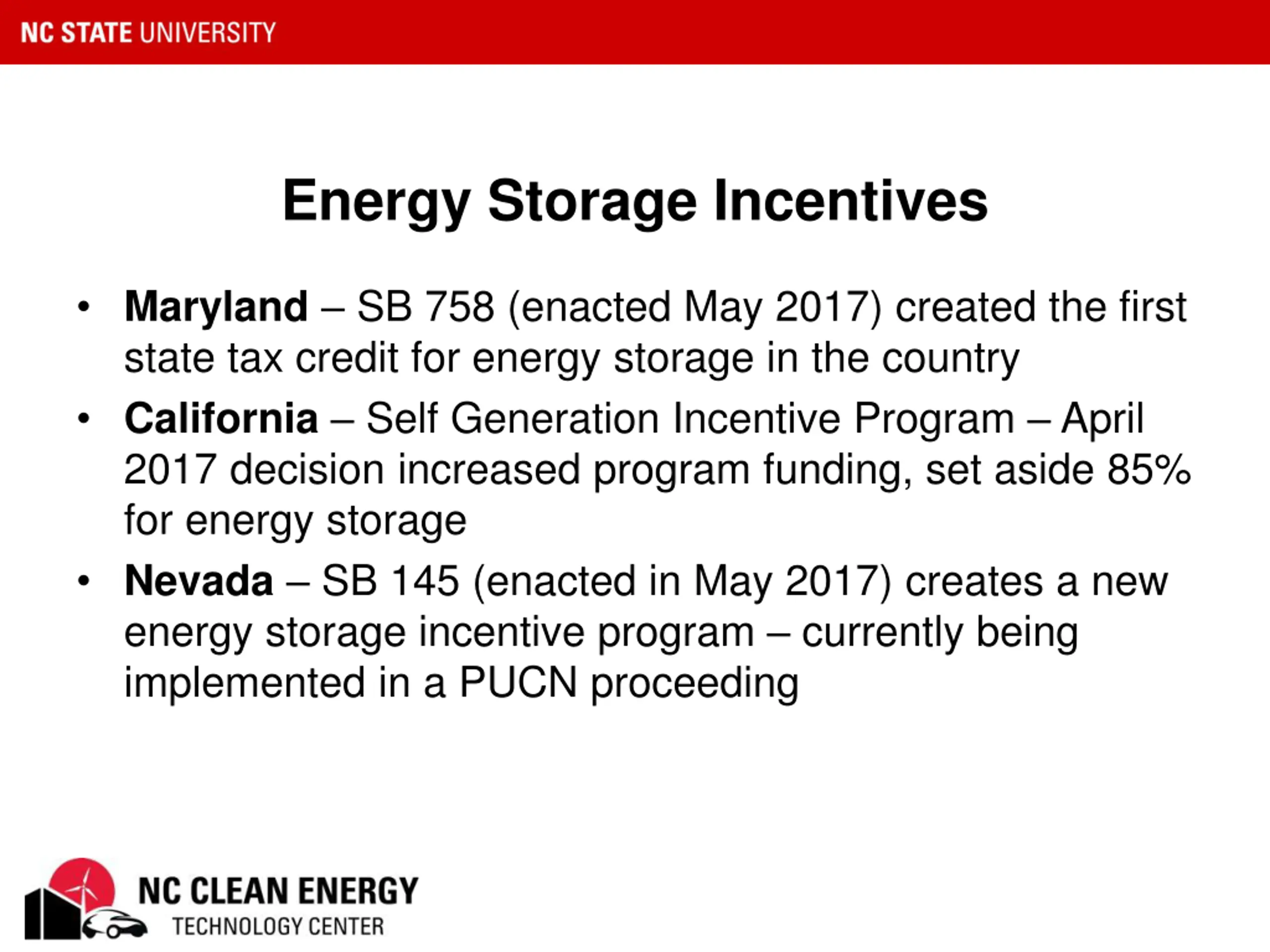 Energy Storage Incentives Maryland SB 758 (enacted May 2017) created the first state tax credit for energy storage in the country California Self Generation Incentive Program April 2017 decision increased program funding, set aside 85% for energy storage Nevada SB 145 (enacted in May 2017) creates a new energy storage incentive program currently being implemented in a PUCN proceeding