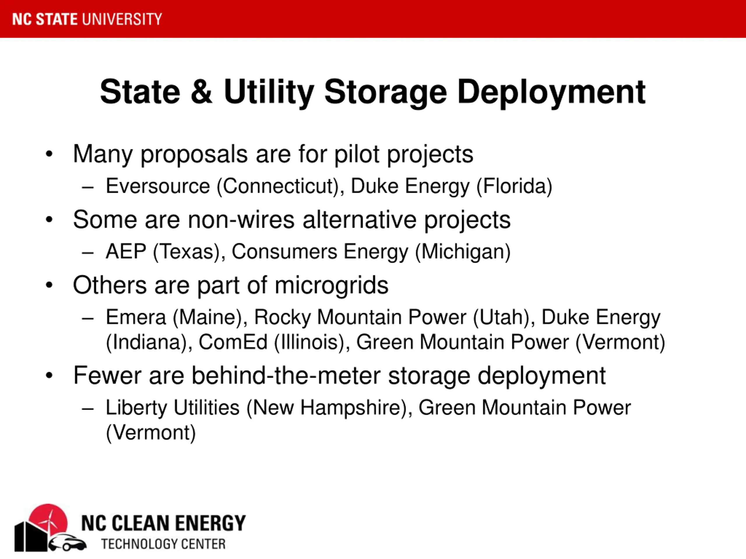 State & Utility Storage Deployment Many proposals are for pilot projects Eversource (Connecticut), Duke Energy (Florida) Some are non-wires alternative projects AEP (Texas), Consumers Energy (Michigan) Others are part of microgrids Emera (Maine), Rocky Mountain Power (Utah), Duke Energy (Indiana), ComEd (Illinois), Green Mountain Power (Vermont) Fewer are behind-the-meter storage deployment Liberty Utilities (New Hampshire), Green Mountain Power (Vermont)