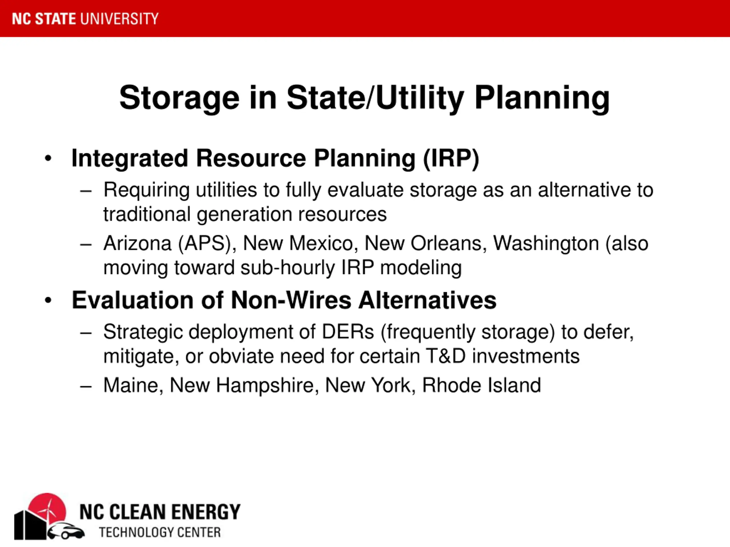 Storage in State/Utility Planning Integrated Resource Planning (IRP) Requiring utilities to fully evaluate storage as an alternative to traditional generation resources Arizona (APS), New Mexico, New Orleans, Washington (also moving toward sub-hourly IRP modeling Evaluation of Non-Wires Alternatives Strategic deployment of DERs (frequently storage) to defer, mitigate, or obviate need for certain T&D investments Maine, New Hampshire, New York, Rhode Island