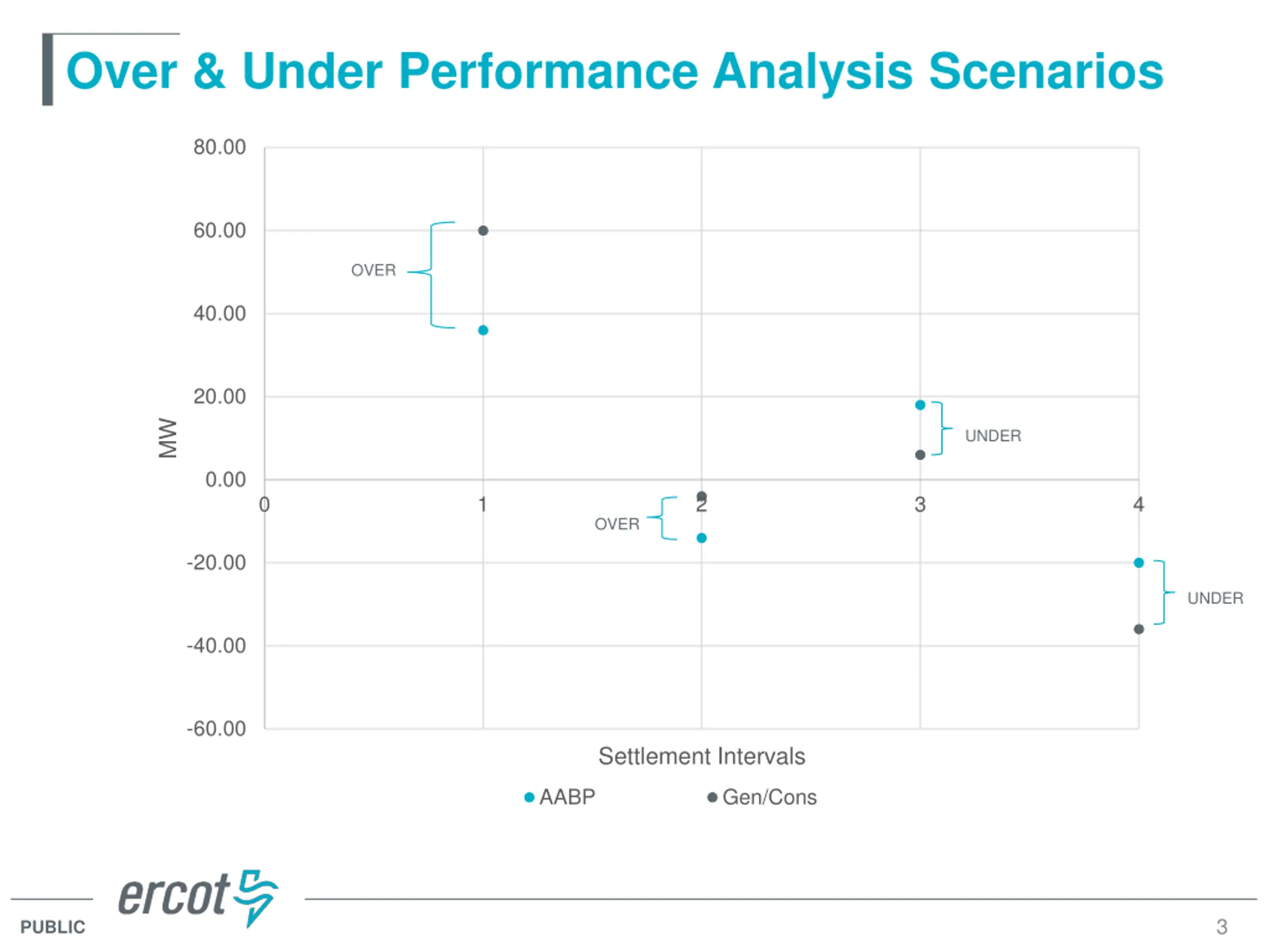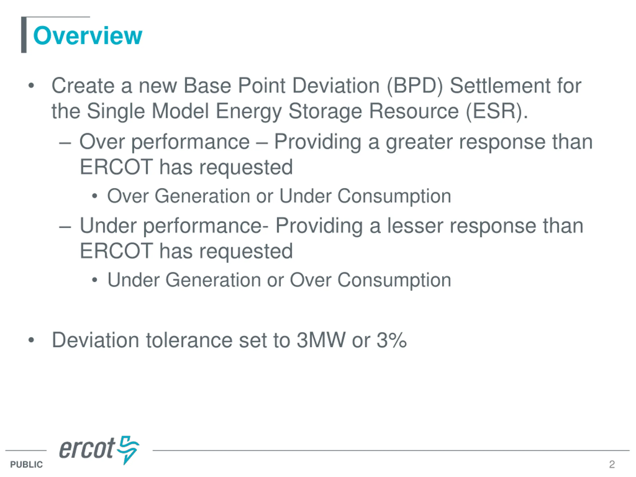 Overview Create a new Base Point Deviation (BPD) Settlement for the Single Model Energy Storage Resource (ESR). Over performance Providing a greater response than ERCOT has requested Over Generation or Under Consumption Under performance- Providing a lesser response than ERCOT has requested Under Generation or Over Consumption Deviation tolerance set to 3MW or 3% 2 PUBLIC