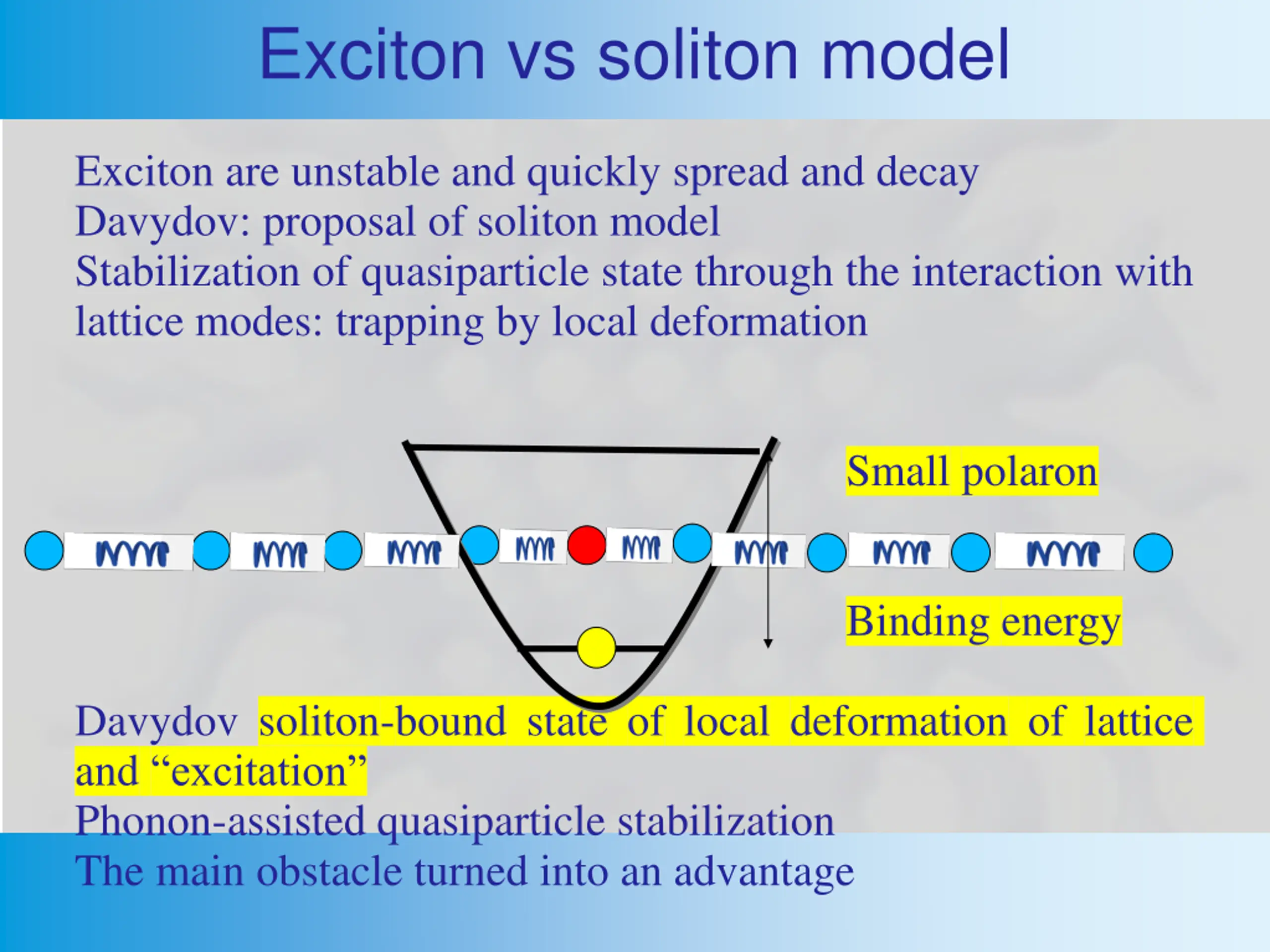 Exciton vs soliton model Exciton are unstable and quickly spread and decay Davydov: proposal of soliton model Stabilization of quasiparticle state through the interaction with lattice modes: trapping by local deformation Small polaron Binding energy Davydov soliton-bound state of local deformation of lattice and excitation Phonon-assisted quasiparticle stabilization The main obstacle turned into an advantage