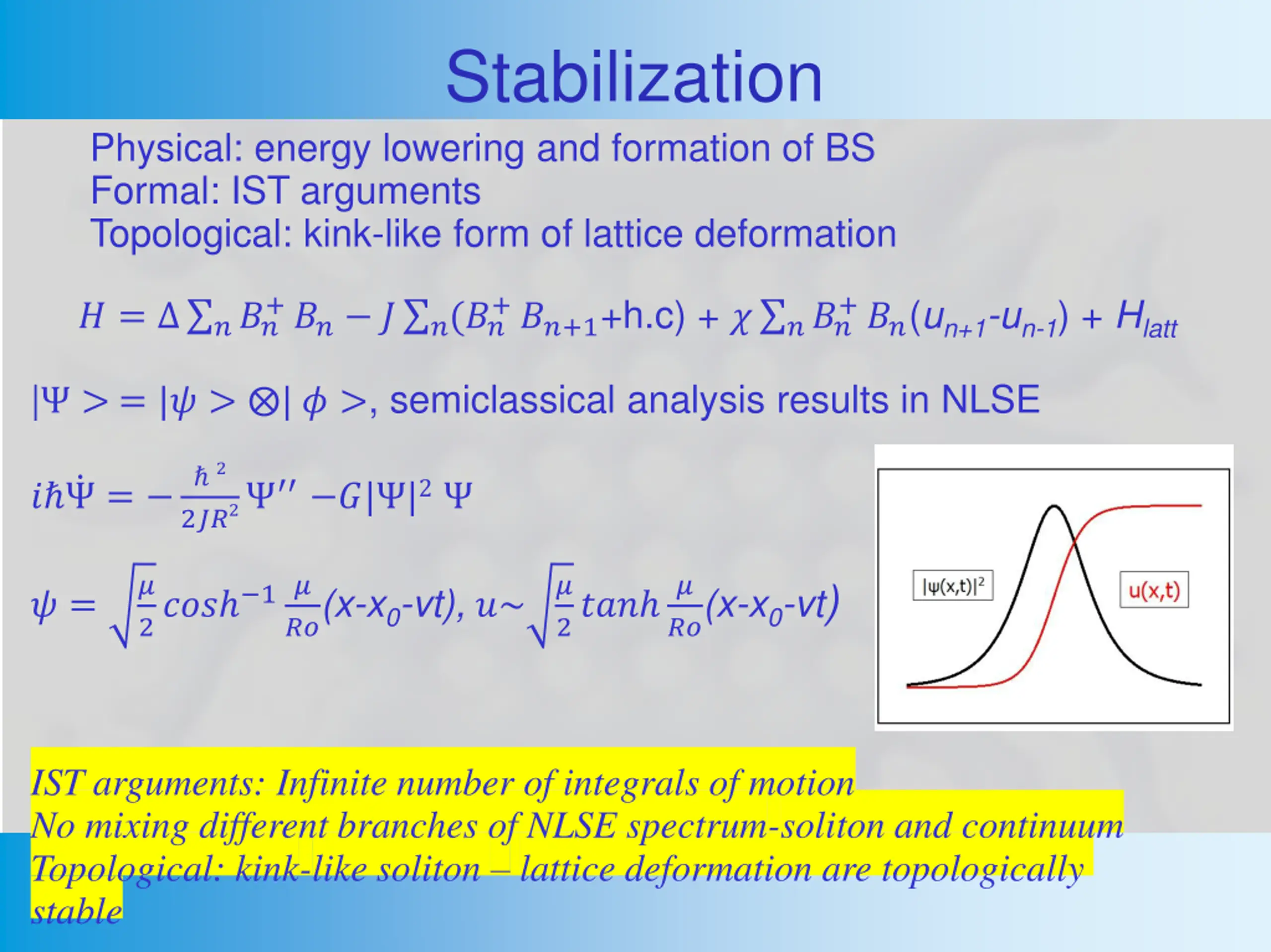 Stabilization Physical: energy lowering and formation of BS Formal: IST arguments Topological: kink-like form of lattice deformation +??+1+h.c) + ? ??? +??(un+1-un-1) + Hlatt +?? ? ?(?? ? = ??? | > = |? > | ?>, semiclassical analysis results in NLSE 2 2??2 ?| |2 ? = ? 2??? 1? ? 2??? ? ??(x-x0-vt) ??(x-x0-vt), ?~ ? = IST arguments: Infinite number of integrals of motion No mixing different branches of NLSE spectrum-soliton and continuum Topological: kink-like soliton lattice deformation are topologically stable