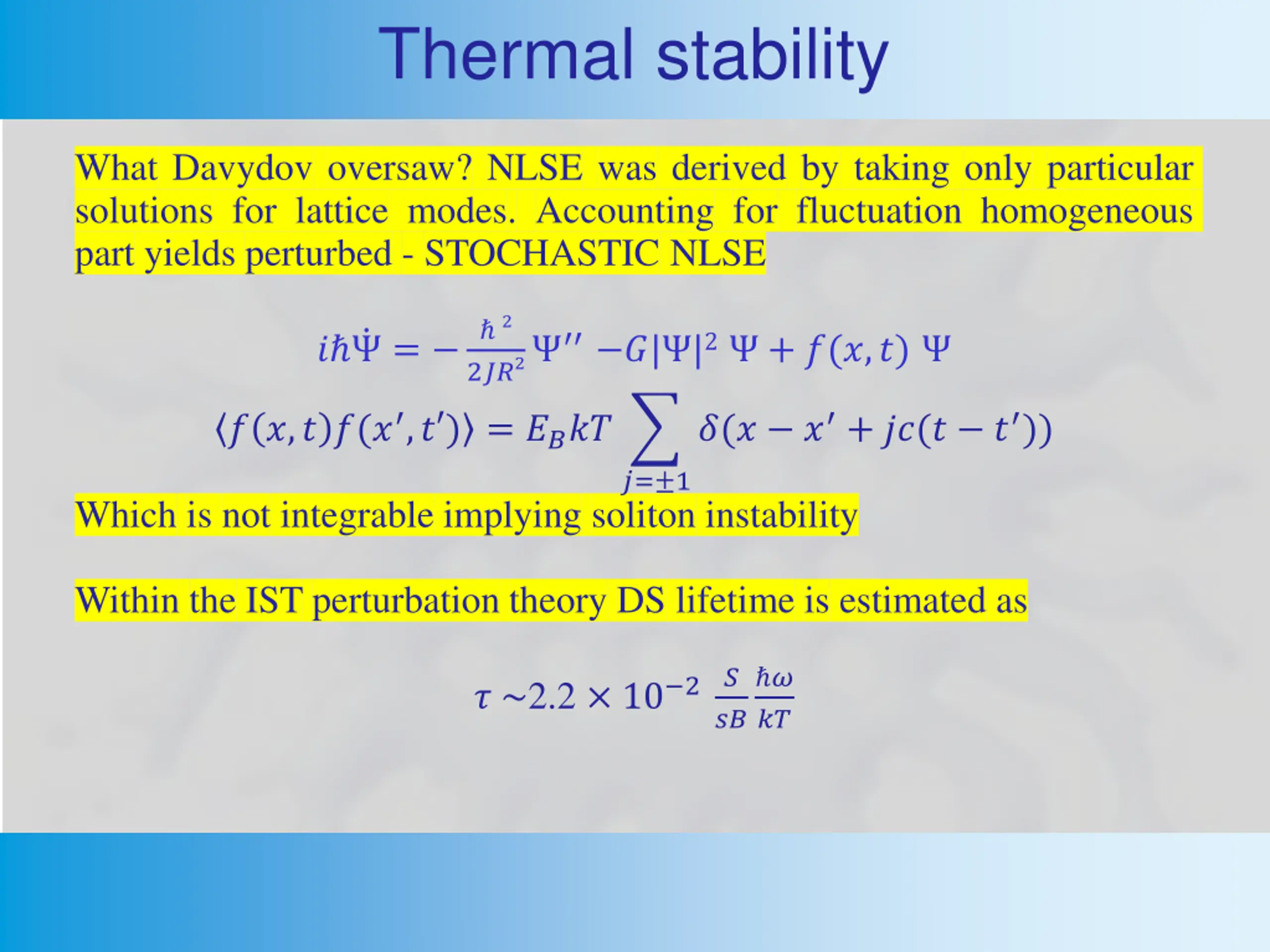 Thermal stability What Davydov oversaw? NLSE was derived by taking only particular solutions for lattice modes. Accounting for fluctuation homogeneous part yields perturbed - STOCHASTIC NLSE 2 2??2 ?| |2 + ?(?,?) ? ?,? ?(? ,? ) = ???? ? = ?(? ? + ??(? ? )) ?= 1 Which is not integrable implying soliton instability Within the IST perturbation theory DS lifetime is estimated as ? ~2.2 10 2? ? ?? ??