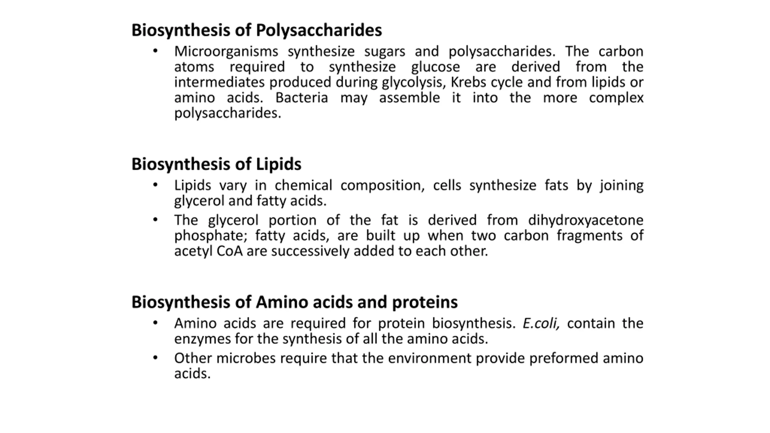Biosynthesis of Polysaccharides Microorganisms synthesize sugars and polysaccharides. The carbon atoms required to synthesize glucose are derived from the intermediates produced during glycolysis, Krebs cycle and from lipids or amino acids. Bacteria may assemble it into the more complex polysaccharides. Biosynthesis of Lipids Lipids vary in chemical composition, cells synthesize fats by joining glycerol and fatty acids. The glycerol portion of the fat is derived from dihydroxyacetone phosphate; fatty acids, are built up when two carbon fragments of acetyl CoA are successively added to each other. Biosynthesis of Amino acids and proteins Amino acids are required for protein biosynthesis. E.coli, contain the enzymes for the synthesis of all the amino acids. Other microbes require that the environment provide preformed amino acids.