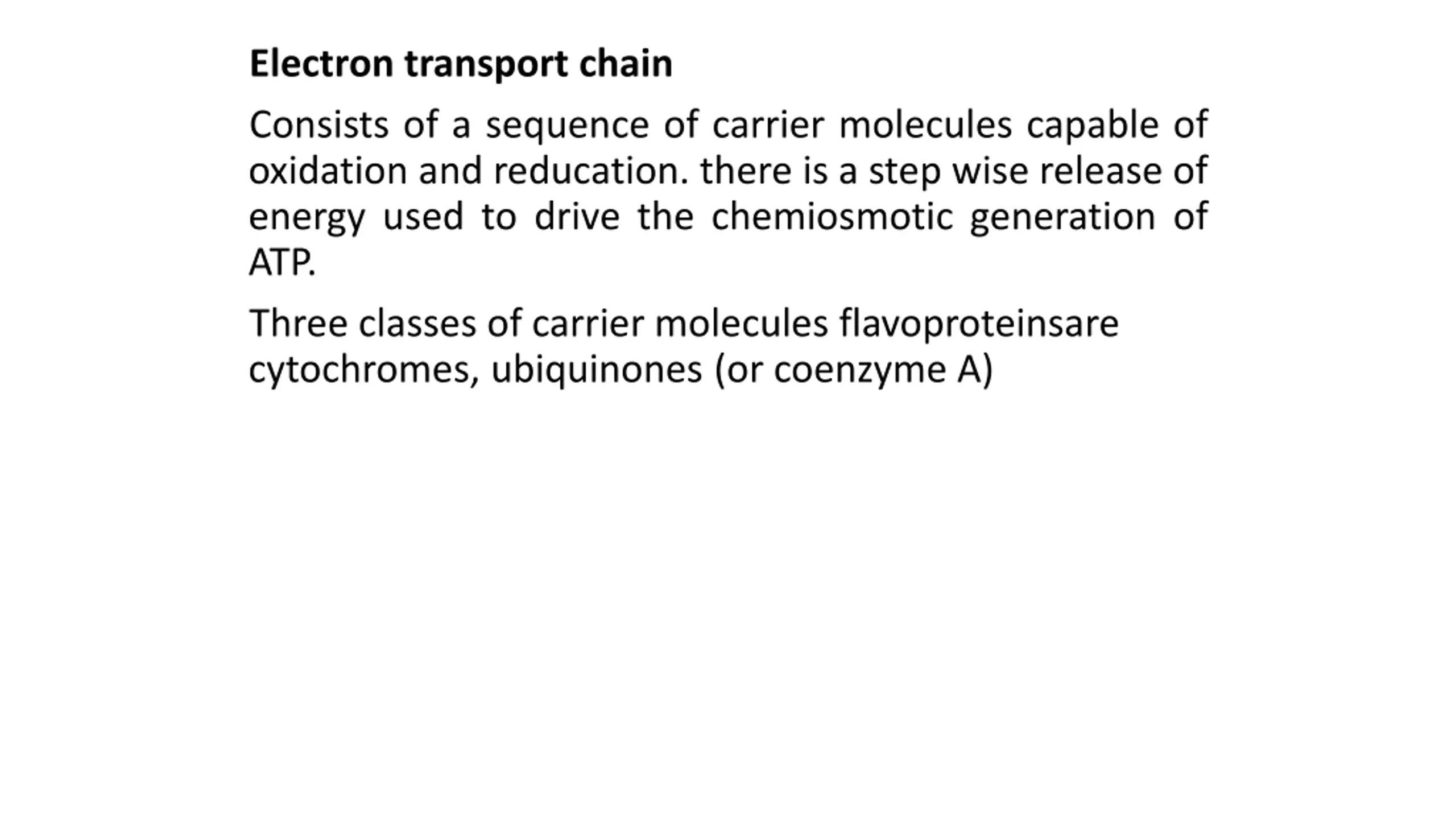 Electron transport chain Consists of a sequence of carrier molecules capable of oxidation and reducation. there is a step wise release of energy used to drive the chemiosmotic generation of ATP. Three classes of carrier molecules flavoproteinsare cytochromes, ubiquinones (or coenzyme A)