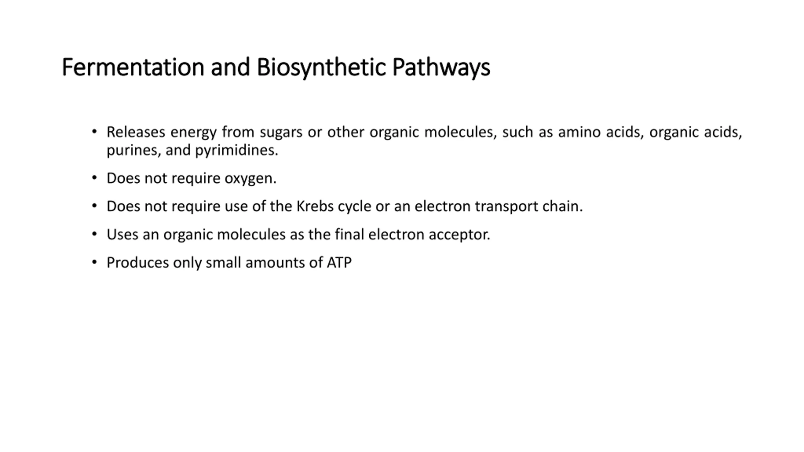 Fermentation and Biosynthetic Pathways Fermentation and Biosynthetic Pathways Releases energy from sugars or other organic molecules, such as amino acids, organic acids, purines, and pyrimidines. Does not require oxygen. Does not require use of the Krebs cycle or an electron transport chain. Uses an organic molecules as the final electron acceptor. Produces only small amounts of ATP
