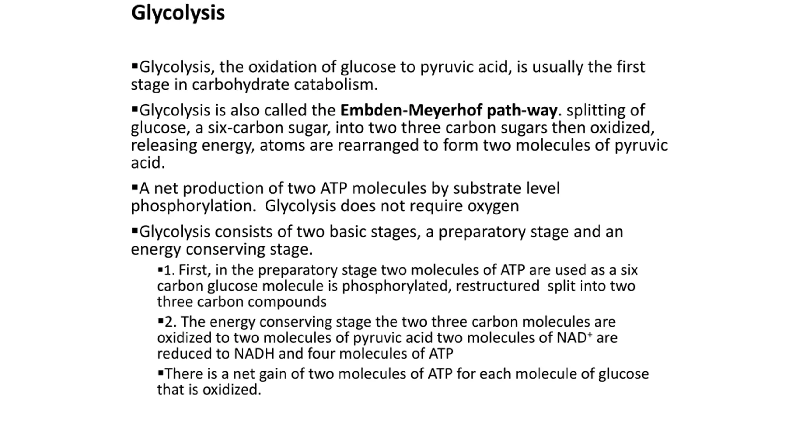 Glycolysis Glycolysis, the oxidation of glucose to pyruvic acid, is usually the first stage in carbohydrate catabolism. Glycolysis is also called the Embden-Meyerhof path-way. splitting of glucose, a six-carbon sugar, into two three carbon sugars then oxidized, releasing energy, atoms are rearranged to form two molecules of pyruvic acid. A net production of two ATP molecules by substrate level phosphorylation. Glycolysis does not require oxygen Glycolysis consists of two basic stages, a preparatory stage and an energy conserving stage. 1. First, in the preparatory stage two molecules of ATP are used as a six carbon glucose molecule is phosphorylated, restructured split into two three carbon compounds 2. The energy conserving stage the two three carbon molecules are oxidized to two molecules of pyruvic acid two molecules of NAD+ are reduced to NADH and four molecules of ATP There is a net gain of two molecules of ATP for each molecule of glucose that is oxidized.