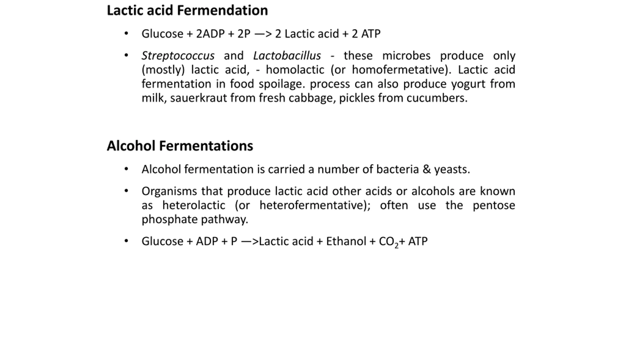 Lactic acid Fermendation Glucose + 2ADP + 2P > 2 Lactic acid + 2 ATP Streptococcus and Lactobacillus - these microbes produce only (mostly) lactic acid, - homolactic (or homofermetative). Lactic acid fermentation in food spoilage. process can also produce yogurt from milk, sauerkraut from fresh cabbage, pickles from cucumbers. Alcohol Fermentations Alcohol fermentation is carried a number of bacteria & yeasts. Organisms that produce lactic acid other acids or alcohols are known as heterolactic (or heterofermentative); often use the pentose phosphate pathway. Glucose + ADP + P >Lactic acid + Ethanol + CO2+ ATP