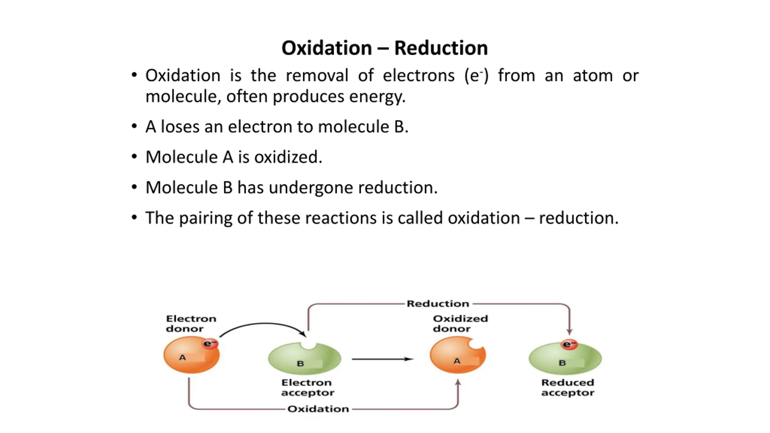 Oxidation Reduction Oxidation is the removal of electrons (e-) from an atom or molecule, often produces energy. A loses an electron to molecule B. Molecule A is oxidized. Molecule B has undergone reduction. The pairing of these reactions is called oxidation reduction.