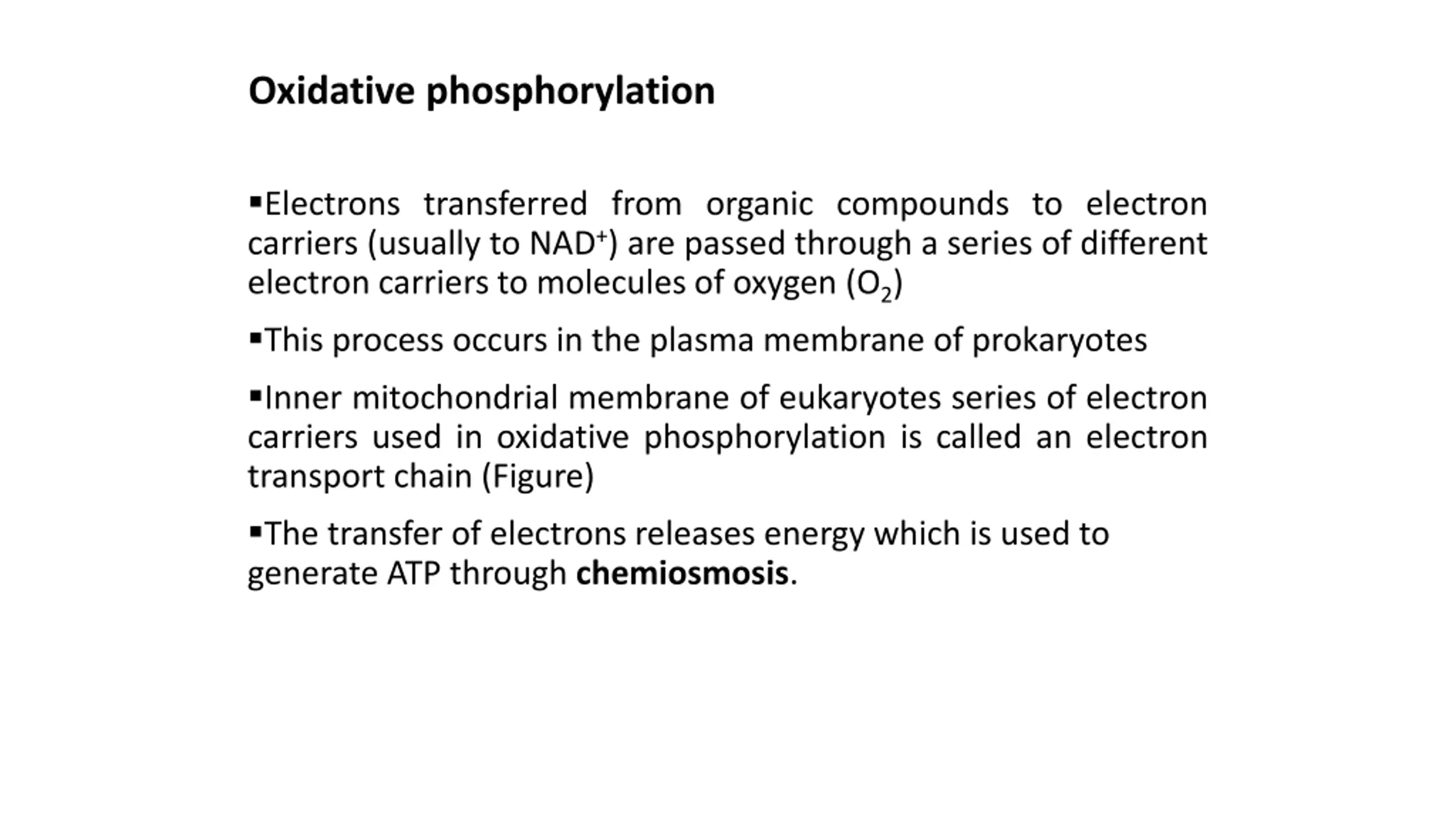 Oxidative phosphorylation Electrons transferred from organic compounds to electron carriers (usually to NAD+) are passed through a series of different electron carriers to molecules of oxygen (O2) This process occurs in the plasma membrane of prokaryotes Inner mitochondrial membrane of eukaryotes series of electron carriers used in oxidative phosphorylation is called an electron transport chain (Figure) The transfer of electrons releases energy which is used to generate ATP through chemiosmosis.