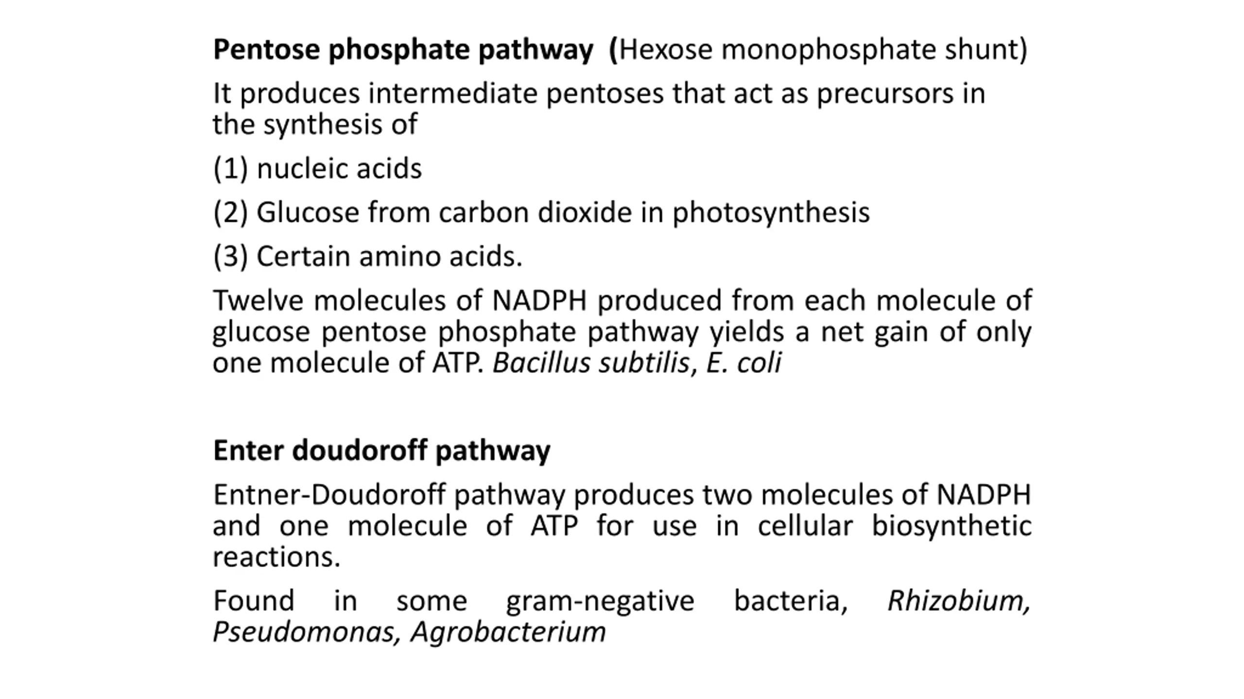 Pentose phosphate pathway (Hexose monophosphate shunt) It produces intermediate pentoses that act as precursors in the synthesis of (1) nucleic acids (2) Glucose from carbon dioxide in photosynthesis (3) Certain amino acids. Twelve molecules of NADPH produced from each molecule of glucose pentose phosphate pathway yields a net gain of only one molecule of ATP. Bacillus subtilis, E. coli Enter doudoroff pathway Entner-Doudoroff pathway produces two molecules of NADPH and one molecule of ATP for use in cellular biosynthetic reactions. Found in some gram-negative Pseudomonas, Agrobacterium bacteria, Rhizobium,