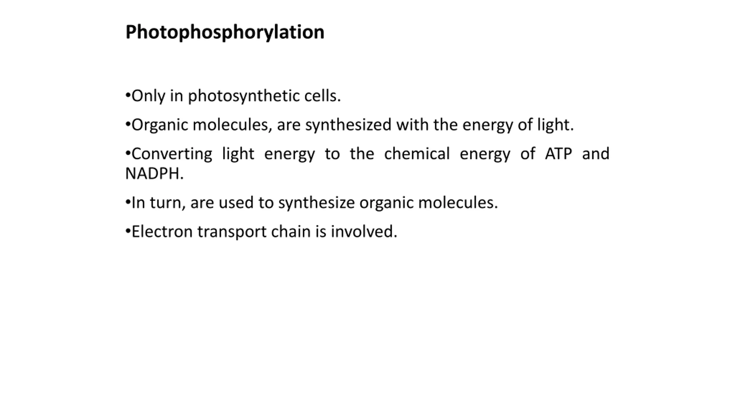 Photophosphorylation Only in photosynthetic cells. Organic molecules, are synthesized with the energy of light. Converting light energy to the chemical energy of ATP and NADPH. In turn, are used to synthesize organic molecules. Electron transport chain is involved.
