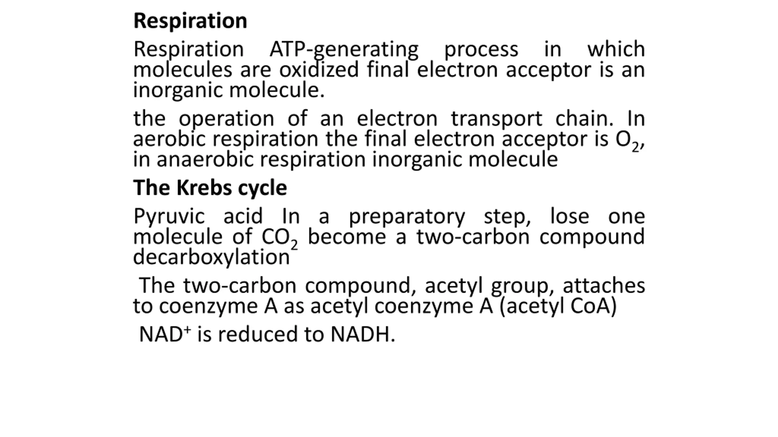 Respiration Respiration ATP-generating process in which molecules are oxidized final electron acceptor is an inorganic molecule. the operation of an electron transport chain. In aerobic respiration the final electron acceptor is O2, in anaerobic respiration inorganic molecule The Krebs cycle Pyruvic acid In a preparatory step, lose one molecule of CO2 become a two-carbon compound decarboxylation The two-carbon compound, acetyl group, attaches to coenzyme A as acetyl coenzyme A (acetyl CoA) NAD+ is reduced to NADH.