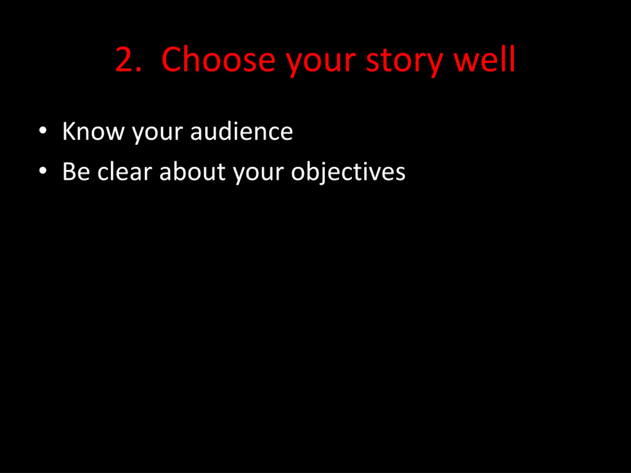 2. Choose your story well Know your audience Be clear about your objectives
