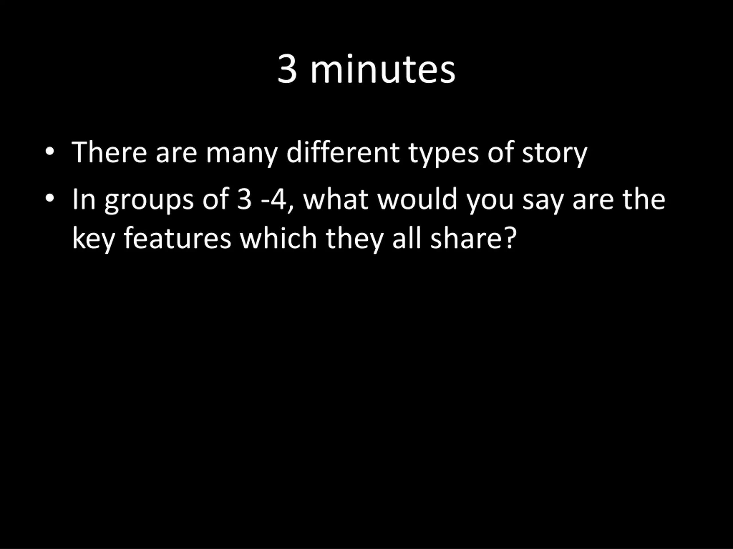 3 minutes There are many different types of story In groups of 3 -4, what would you say are the key features which they all share?