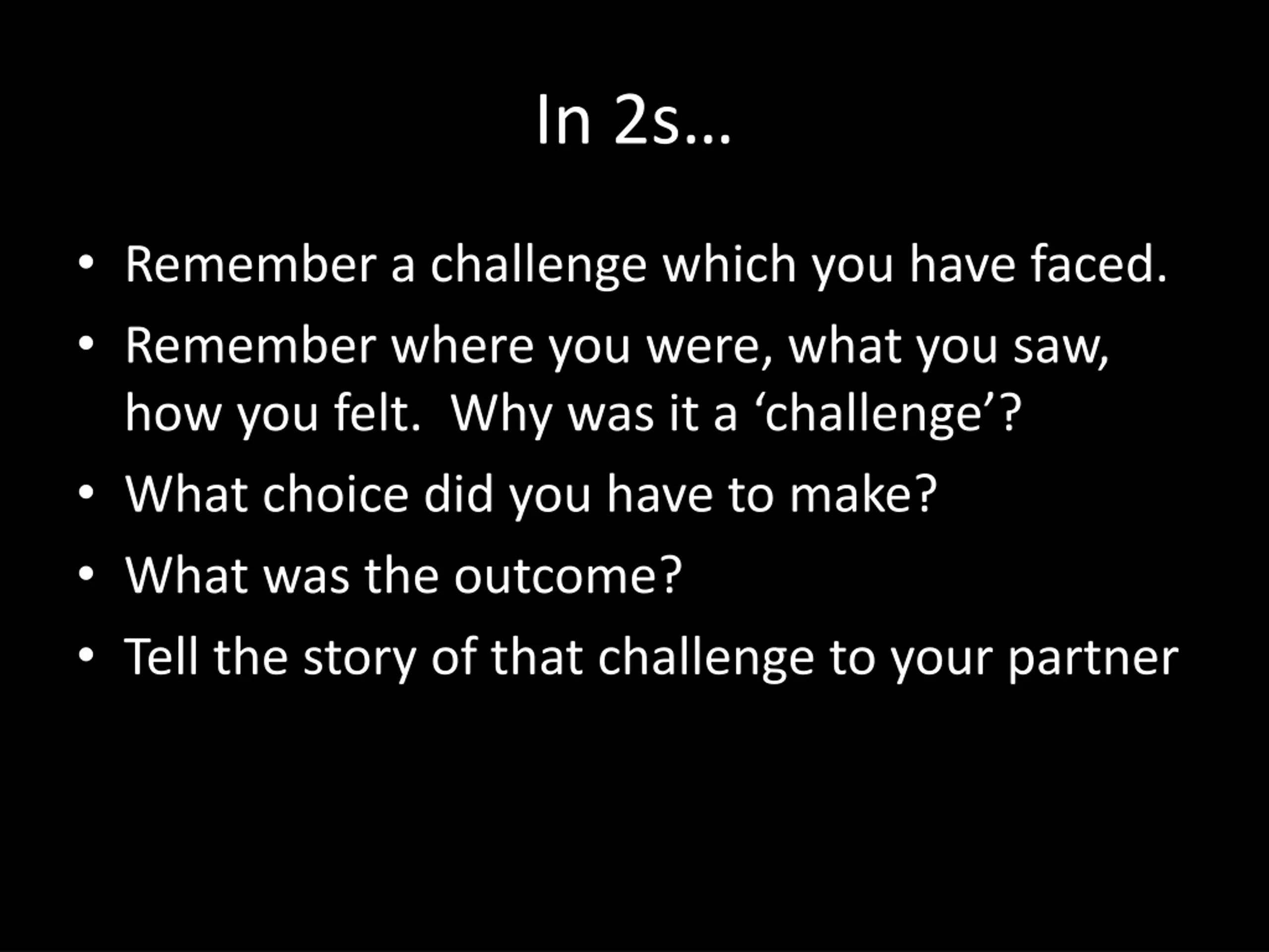 In 2s Remember a challenge which you have faced. Remember where you were, what you saw, how you felt. Why was it a challenge ? What choice did you have to make? What was the outcome? Tell the story of that challenge to your partner