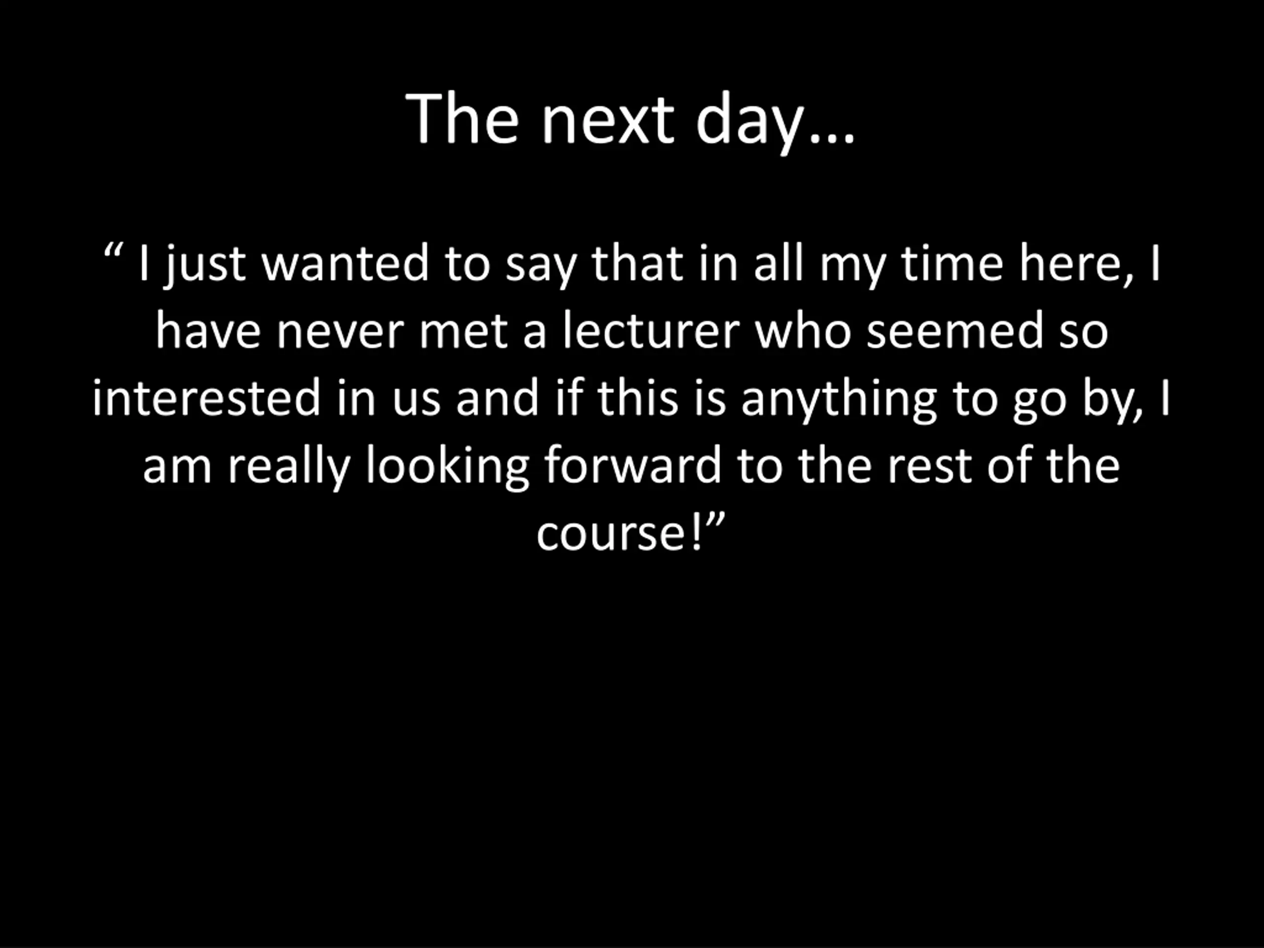 The next day I just wanted to say that in all my time here, I have never met a lecturer who seemed so interested in us and if this is anything to go by, I am really looking forward to the rest of the course!