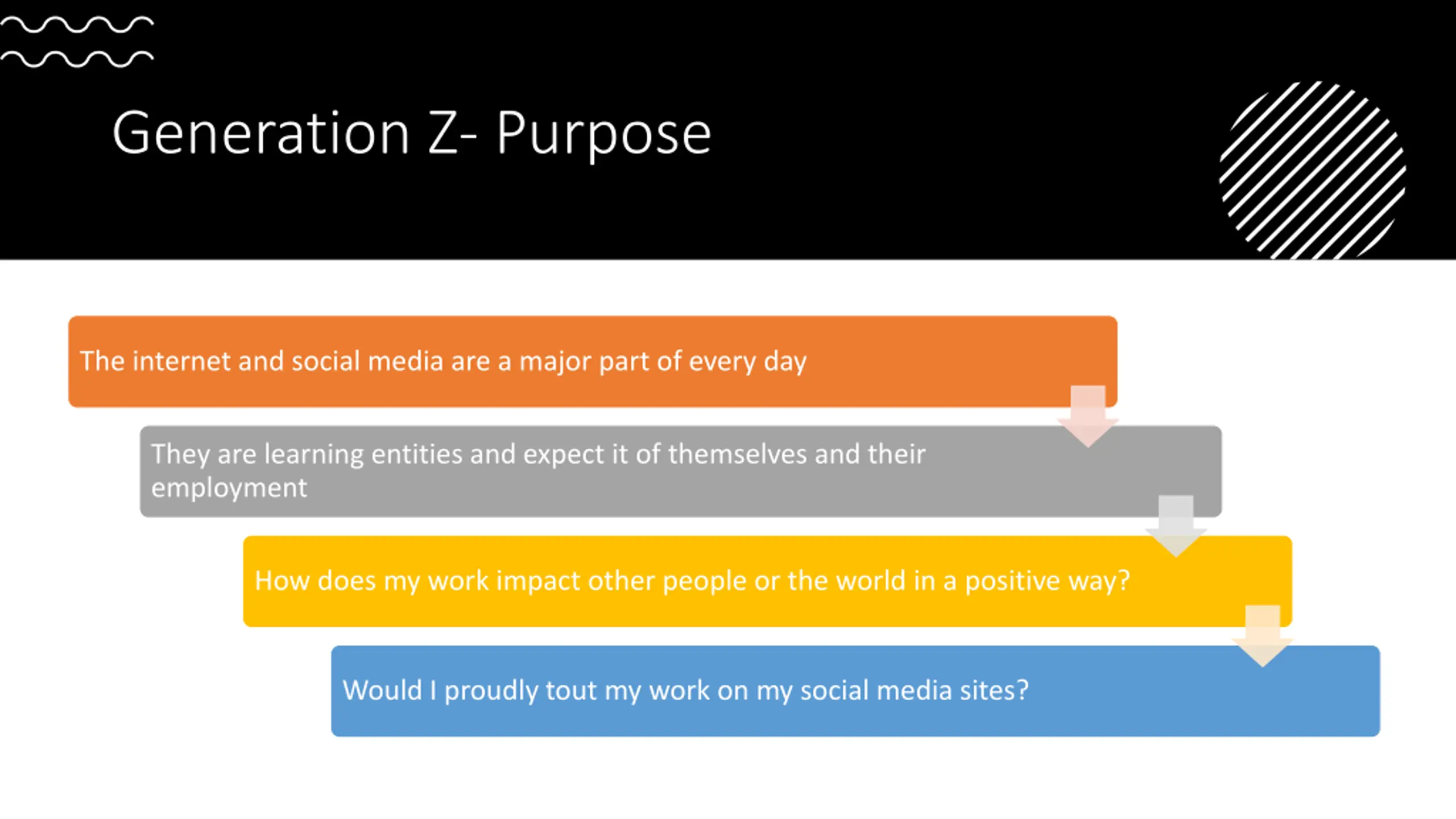 Generation Z- Purpose The internet and social media are a major part of every day They are learning entities and expect it of themselves and their employment How does my work impact other people or the world in a positive way? Would I proudly tout my work on my social media sites?