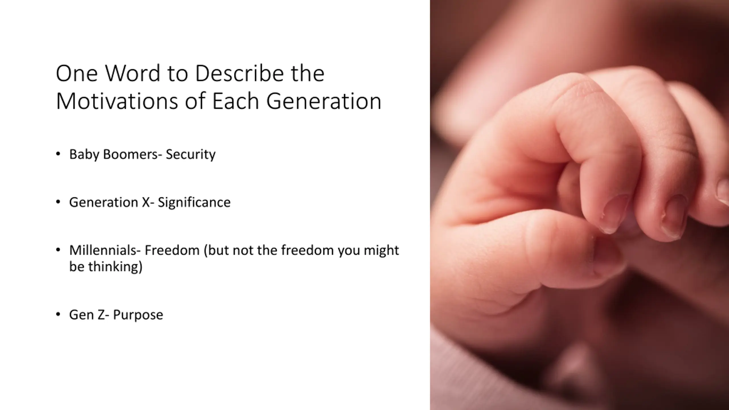 One Word to Describe the Motivations of Each Generation Baby Boomers- Security Generation X- Significance Millennials- Freedom (but not the freedom you might be thinking) Gen Z- Purpose