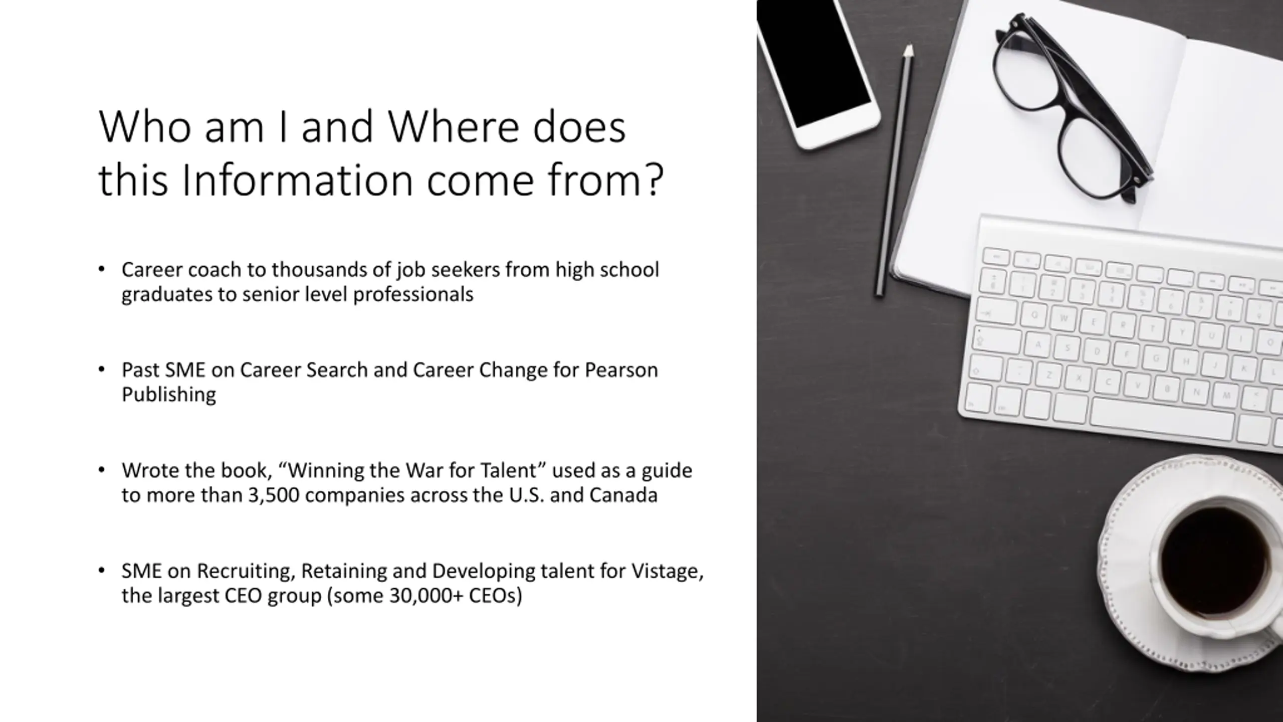 Who am I and Where does this Information come from? Career coach to thousands of job seekers from high school graduates to senior level professionals Past SME on Career Search and Career Change for Pearson Publishing Wrote the book, Winning the War for Talent used as a guide to more than 3,500 companies across the U.S. and Canada SME on Recruiting, Retaining and Developing talent for Vistage, the largest CEO group (some 30,000+ CEOs)