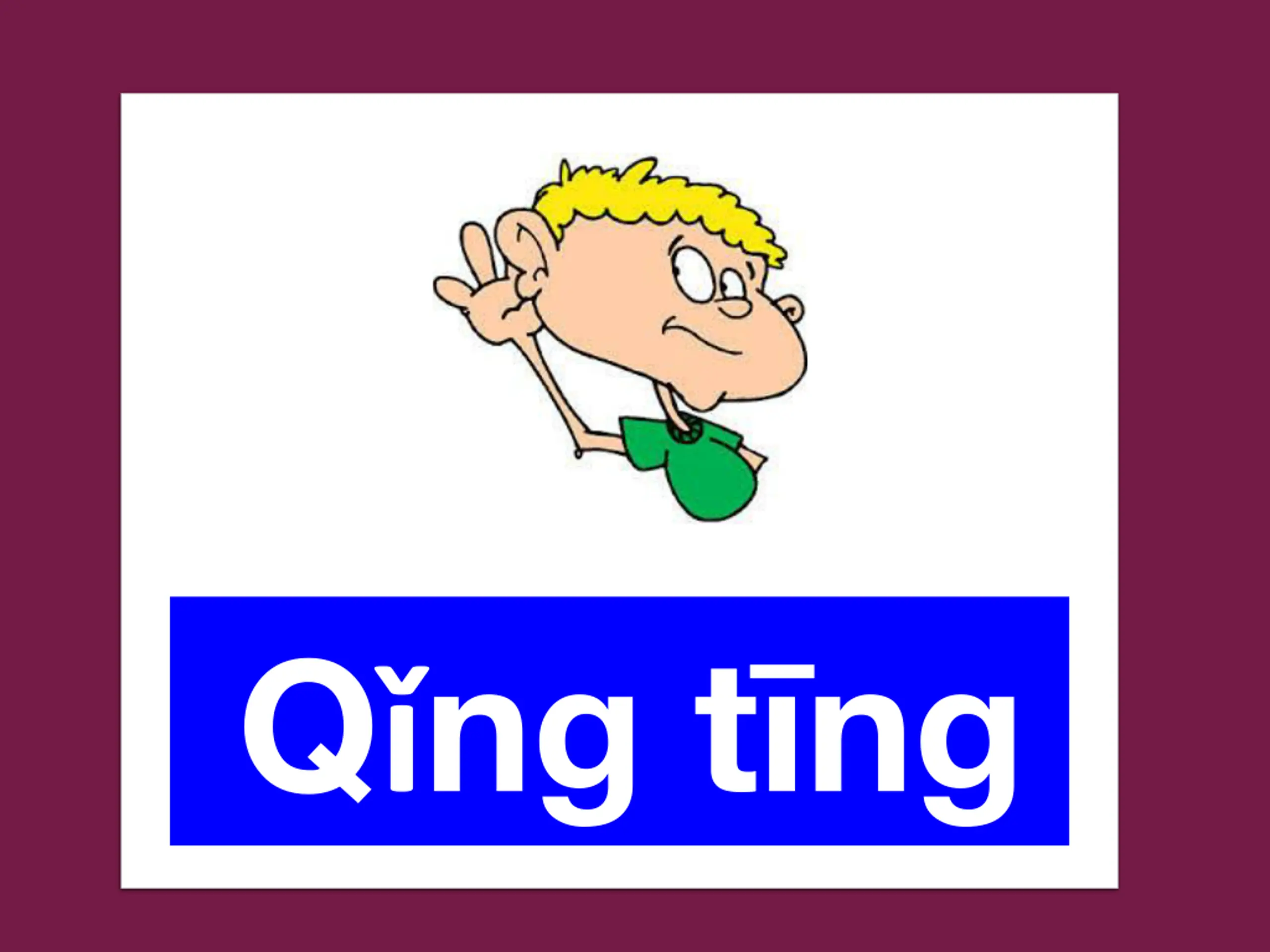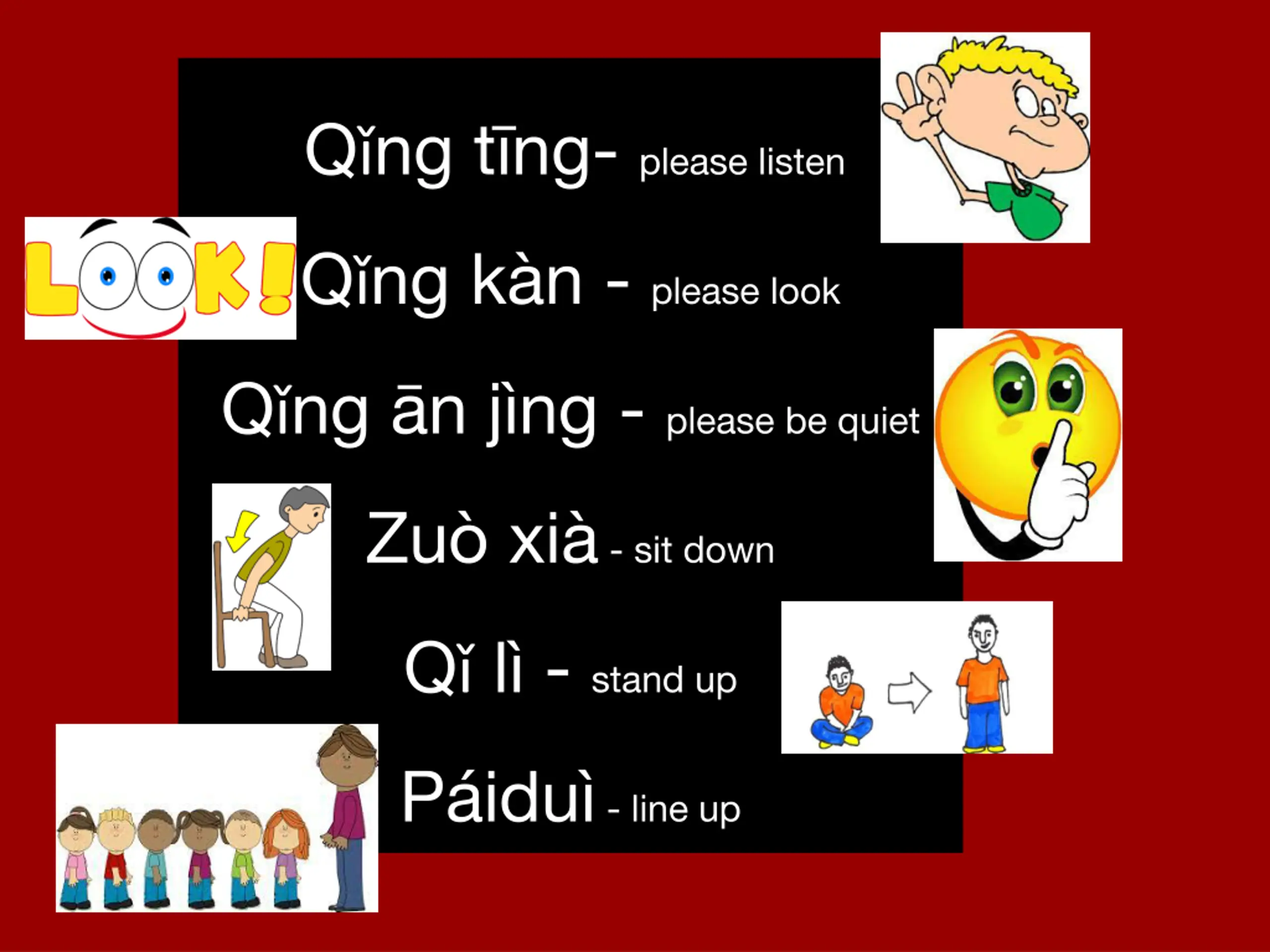 Qng tng- please listen Q ng k n - please look Q ng n j ng - please be quiet Zu xi - sit down Q l - stand up P idu - line up