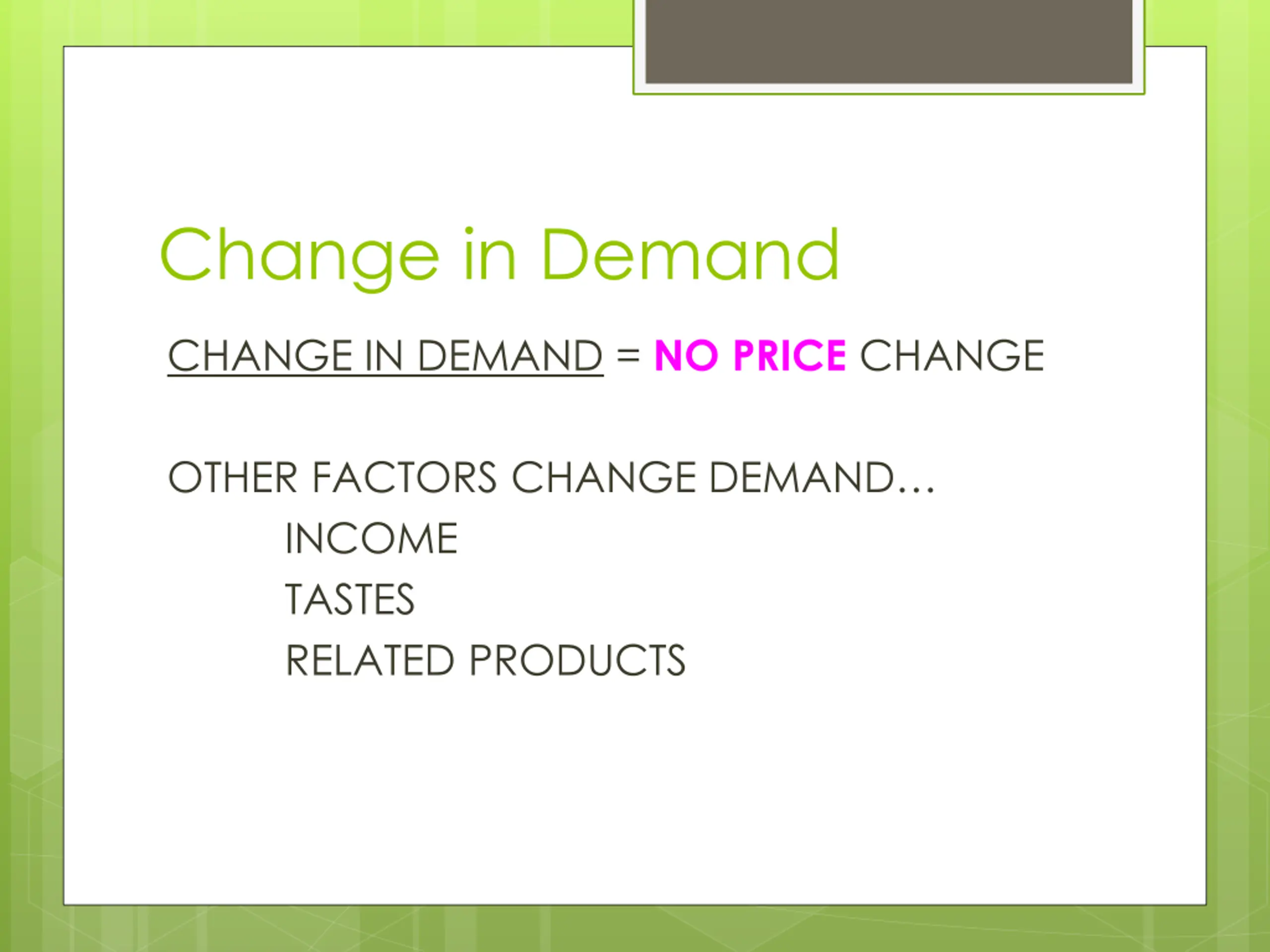 Change in Demand CHANGE IN DEMAND = NO PRICE CHANGE OTHER FACTORS CHANGE DEMAND INCOME TASTES RELATED PRODUCTS