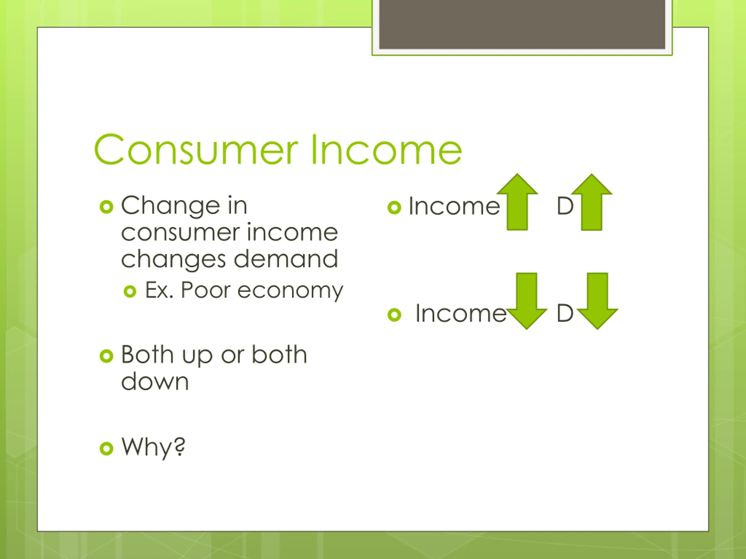 Consumer Income Change in consumer income changes demand Ex. Poor economy Income D Income D Both up or both down Why?