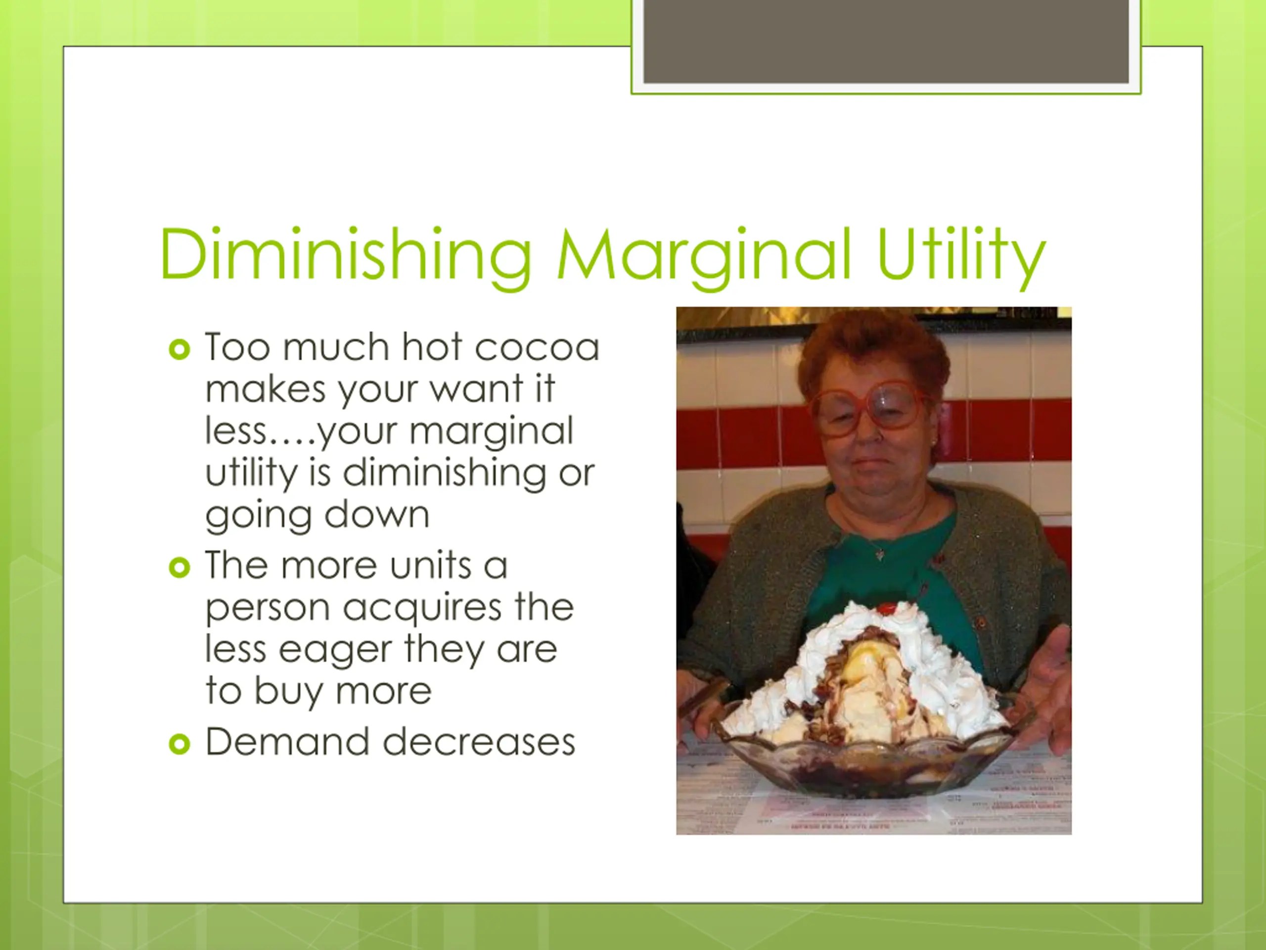 Diminishing Marginal Utility Too much hot cocoa makes your want it less .your marginal utility is diminishing or going down The more units a person acquires the less eager they are to buy more Demand decreases