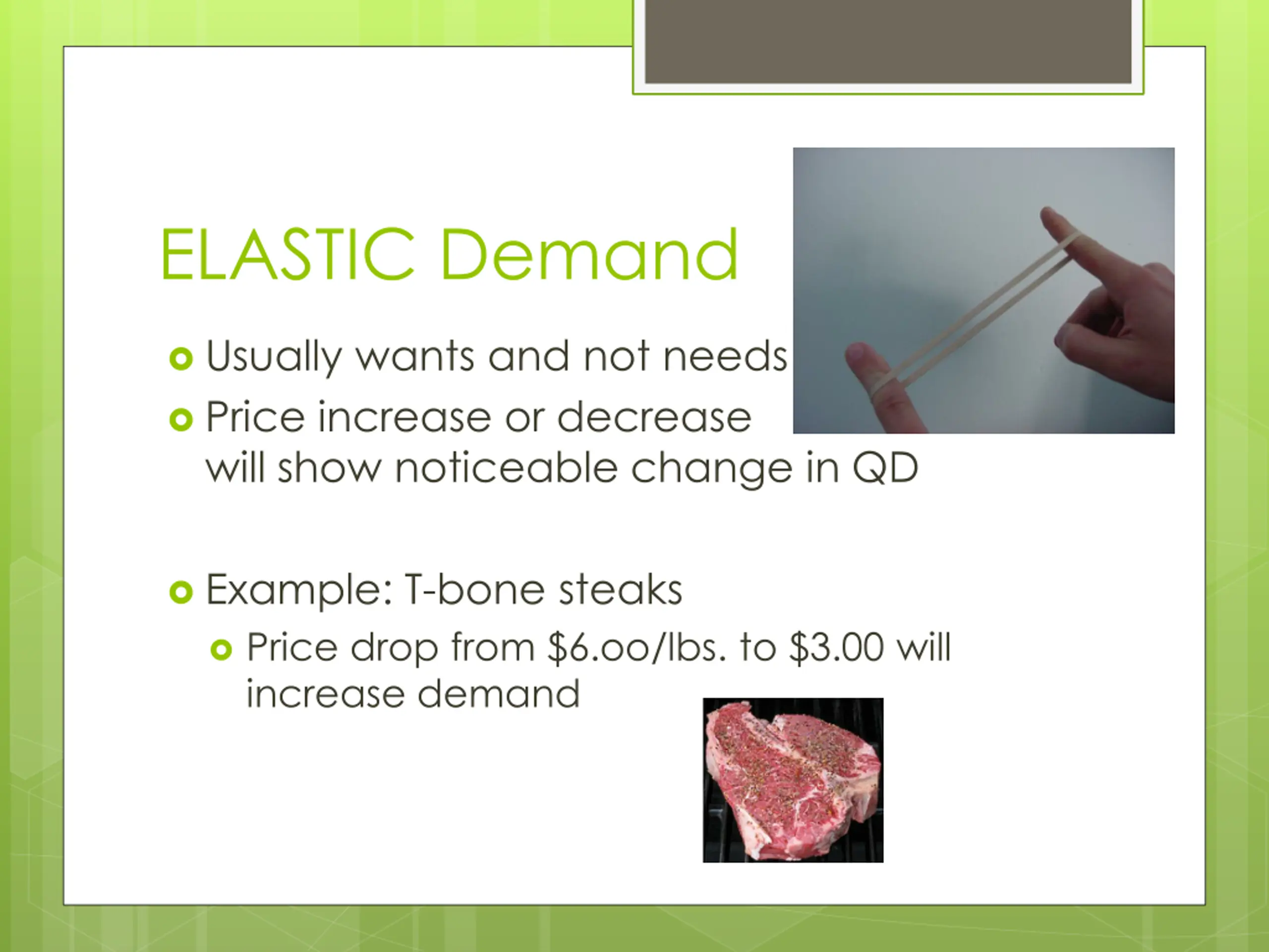 ELASTIC Demand Usually wants and not needs Price increase or decrease will show noticeable change in QD Example: T-bone steaks Price drop from $6.oo/lbs. to $3.00 will increase demand