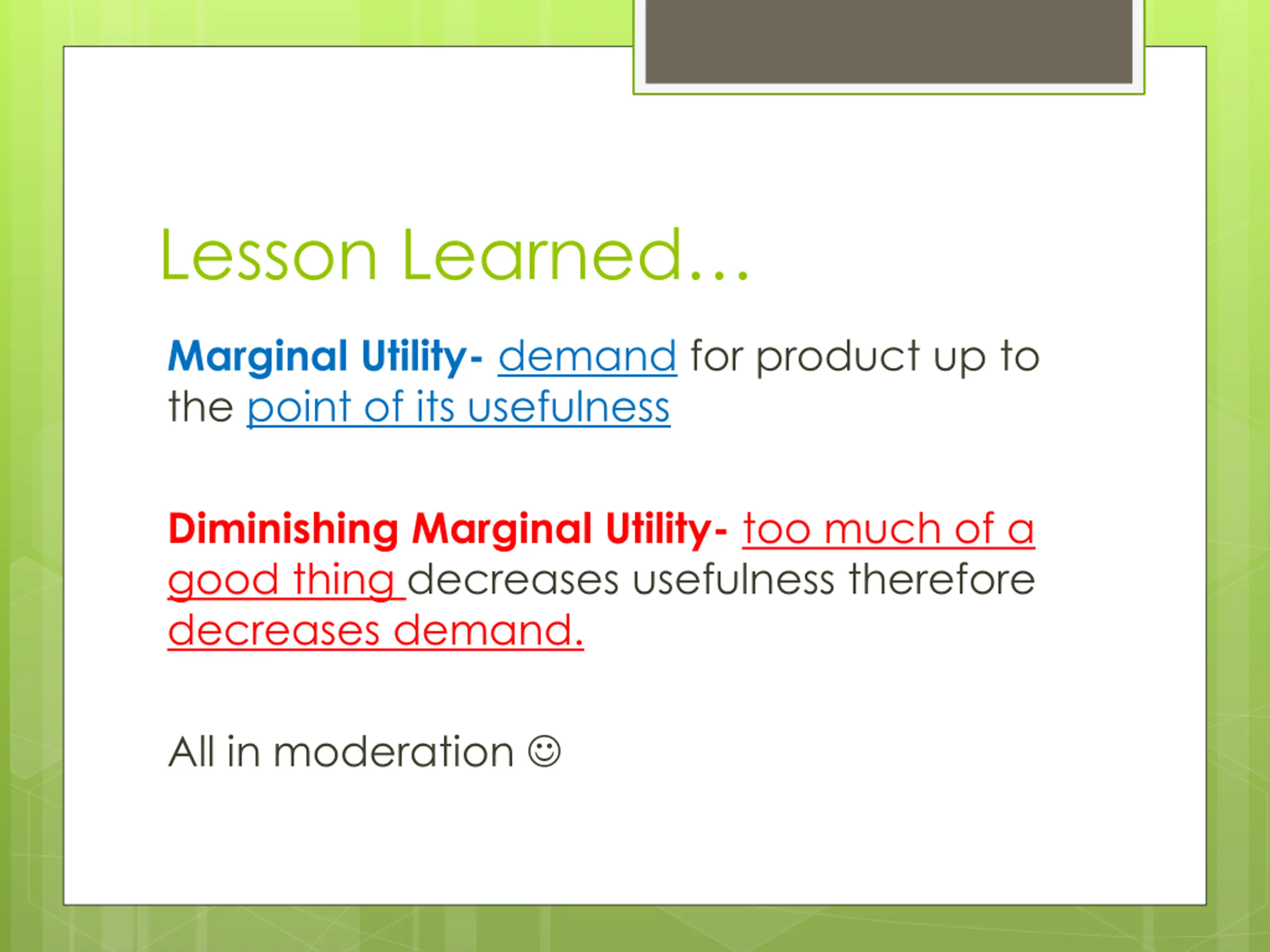 Lesson Learned Marginal Utility- demand for product up to the point of its usefulness Diminishing Marginal Utility- too much of a good thing decreases usefulness therefore decreases demand. All in moderation