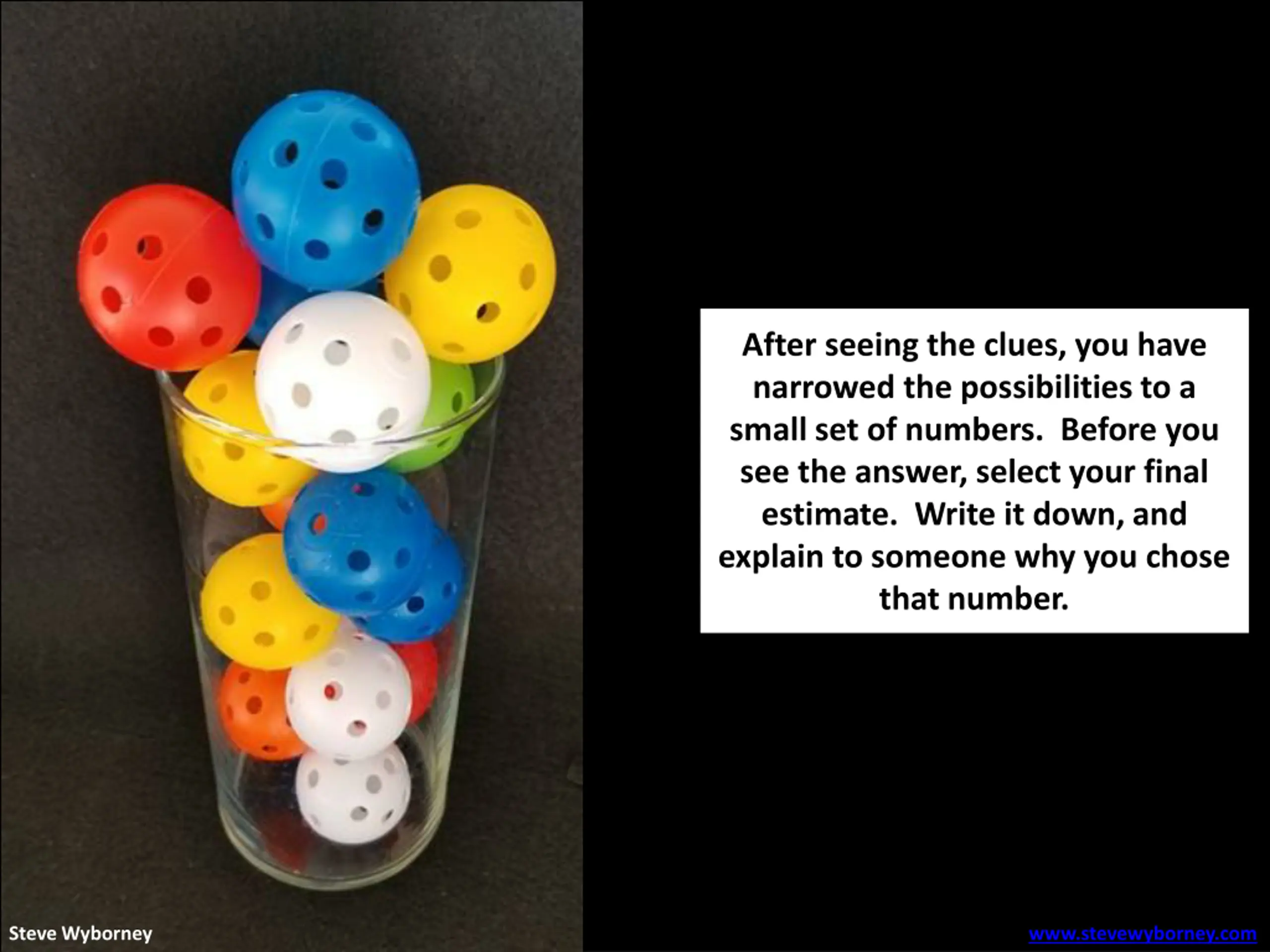 How many practice golf balls are in the cup? As the clues appear, use the information to narrow the possibilities to a smaller set. After each clue, use estimation again to determine which of the remaining answers is the most reasonable. Write down your first estimate. After each clue, you ll see if your estimate is still a possibility. After each clue, if it is no longer possible write down a new estimate and be prepared to explain why you chose it. Steve Wyborney www.stevewyborney.com